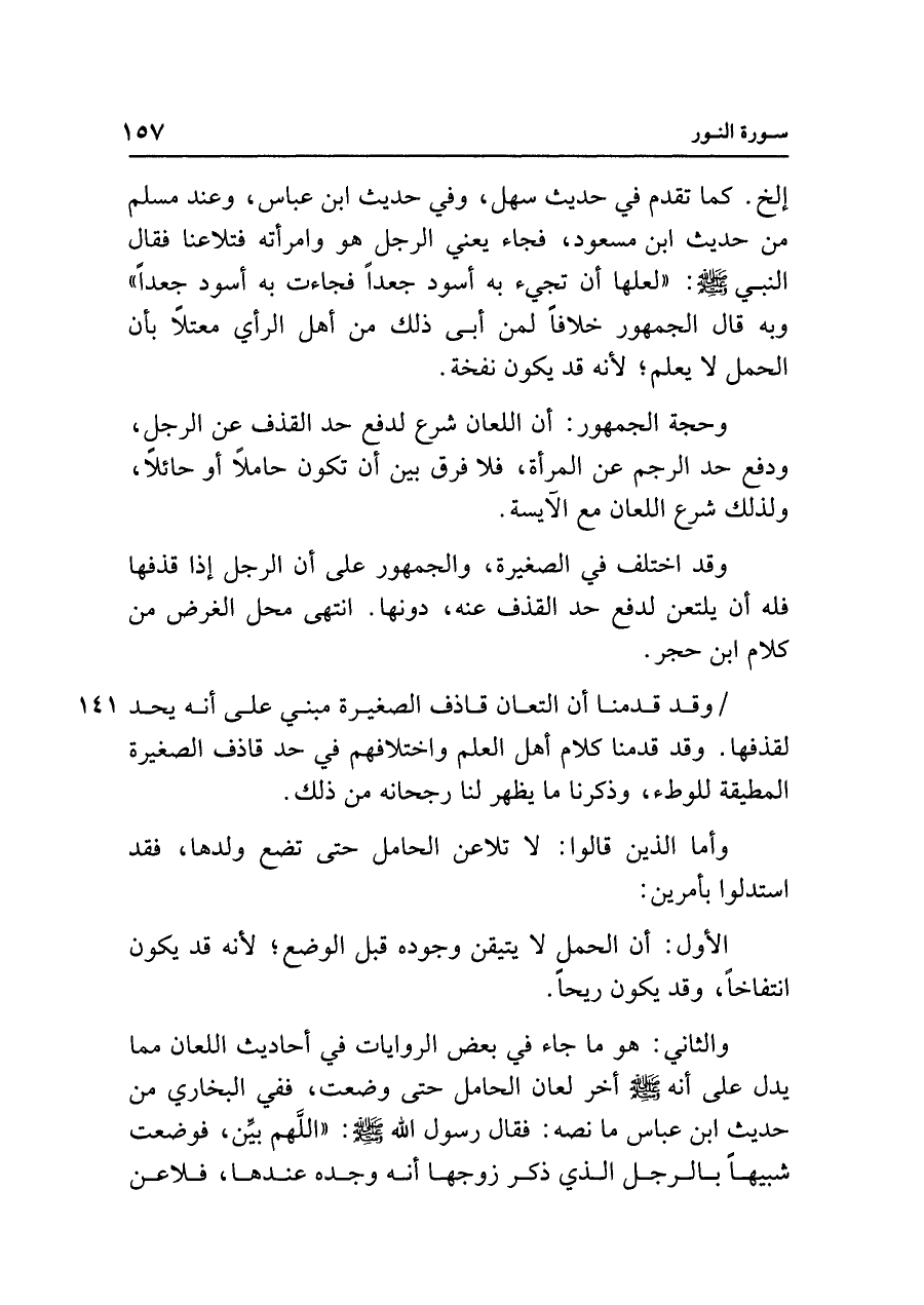 وحجة الجمهور: أن اللعان شرع لدفع حد القذف عن الرجل، ودفع حد الرجم عن المرأة، فلا فرق بين أن تكون حاملًا أو حائلًا، ولذلك شرع اللعان مع الآيسة.