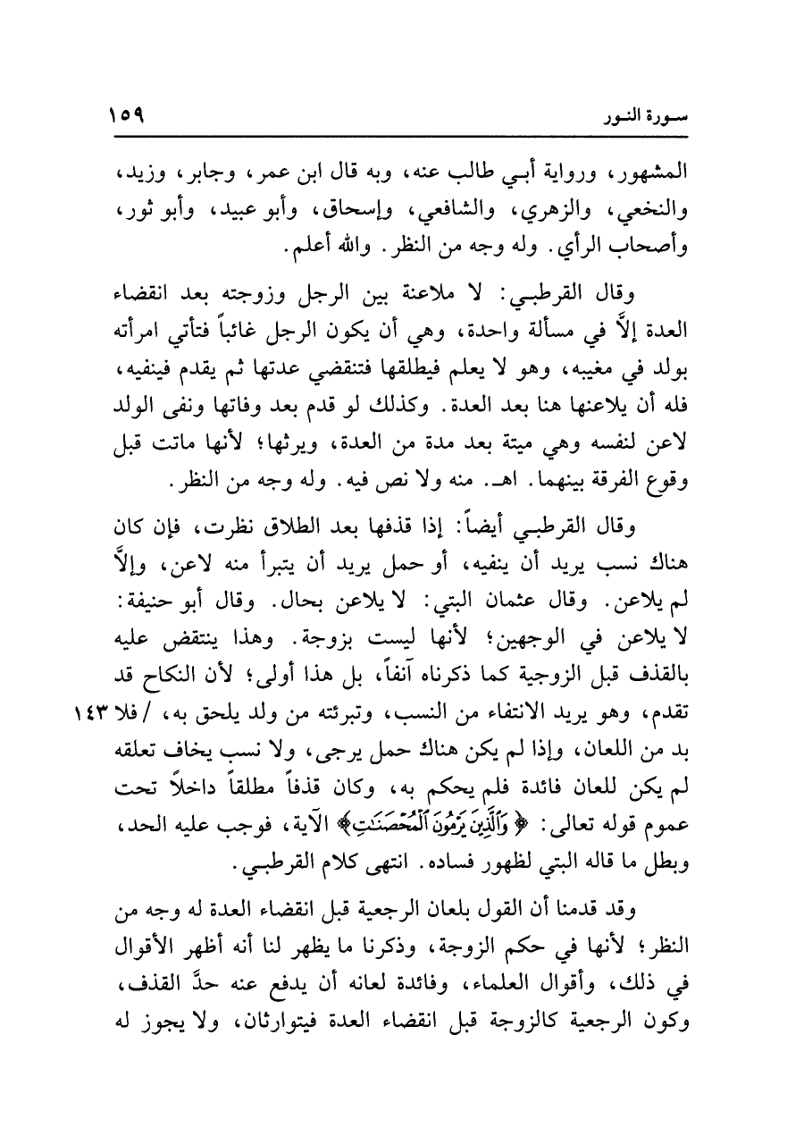 وقال القرطبي أيضًا: إذا قذفها بعد الطلاق نظرت، فإن كان هناك نسب يريد أن ينفيه، أو حمل يريد أن يتبرأ منه لاعن، وإلَّا لم يلاعن. وقال عثمان البتي: لا يلاعن بحال. وقال أَبو حنيفة: لا يلاعن في الوجهين؛ لأنها ليست بزوجة. وهذا ينتقض عليه بالقذف قبل الزوجية كما ذكرناه آنفًا، بل هذا أولى؛ لأن النكاح قد تقدم، وهو يريد الانتفاء من النسب، وتبرئته من ولد يلحق به، فلا بد من اللعان، وإذا لم يكن هناك حمل يرجى، ولا نسب يخاف تعلقه لم يكن للعان فائدة فلم يحكم به، وكان قذفًا مطلقًا داخلًا تحت عموم قوله تعالى: {وَالَّذِينَ يَرْمُونَ الْمُحْصَنَاتِ} الآية، فوجب عليه الحد، وبطل ما قاله البتي لظهور فساده. انتهى كلام القرطبي.