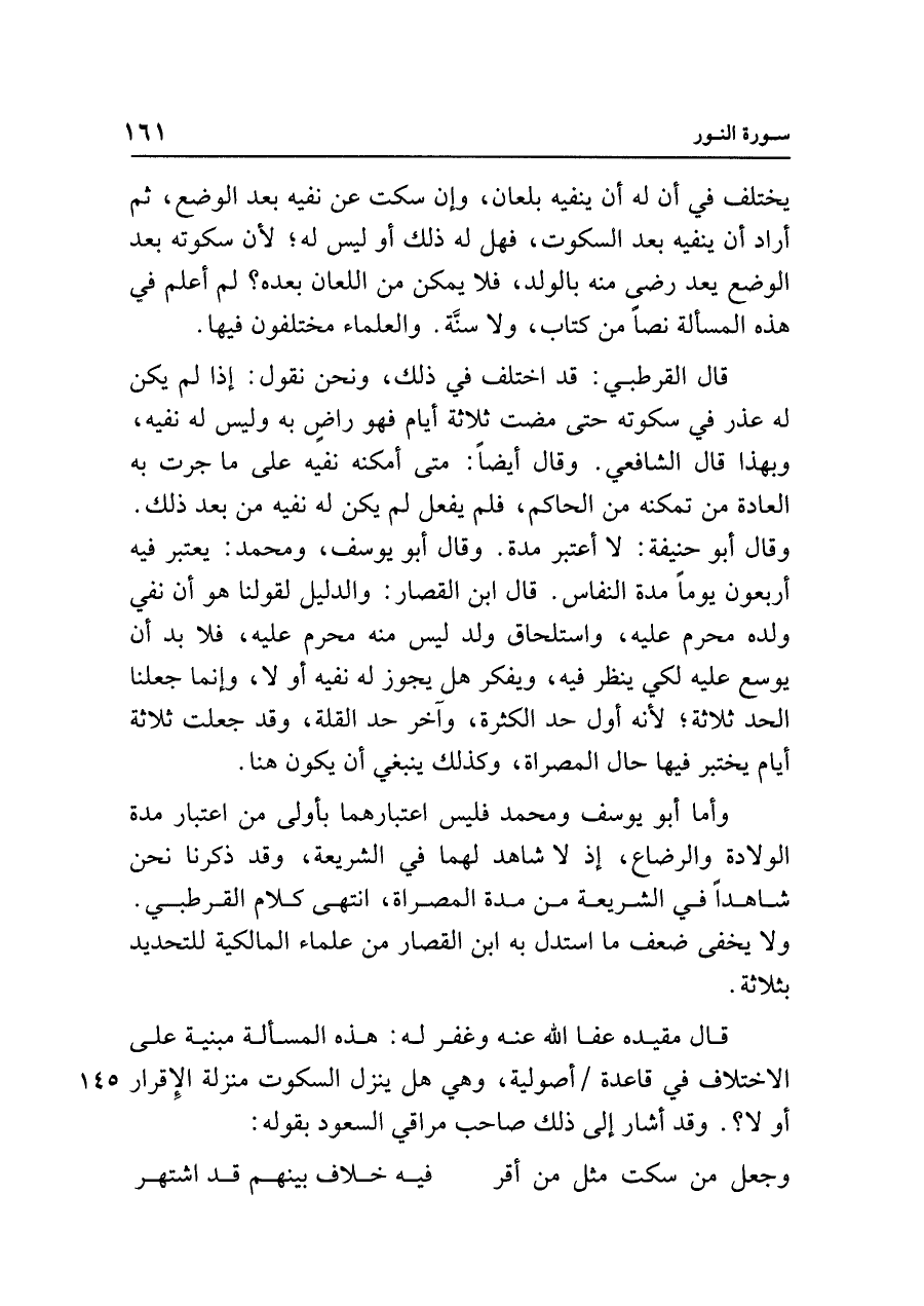 قال القرطبي: قد اختلف في ذلك، ونحن نقول: إذا لم يكن له عذر في سكوته حتى مضت ثلاثة أيام فهو راضٍ به وليس له نفيه، وبهذا قال الشافعي. وقال أيضًا: متى أمكنه نفيه على ما جرت به العادة من تمكنه من الحاكم، فلم يفعل لم يكن له نفيه من بعد ذلك. وقال أَبو حنيفة: لا أعتبر مدة. وقال أَبو يوسف، ومحمد: يعتبر فيه أربعون يومًا مدة النفاس. قال ابن القصار: والدليل لقولنا هو أن نفي ولده محرم عليه، واستلحاق ولد ليس منه محرم عليه، فلا بد أن يوسع عليه لكي ينظر فيه، ويفكر هل يجوز له نفيه أو لا، وإنما جعلنا الحد ثلاثة؛ لأنه أول حد الكثرة، وآخر حد القلة، وقد جعلت ثلاثة أيام يختبر فيها حال المصراة، وكذلك ينبغي أن يكون هنا.