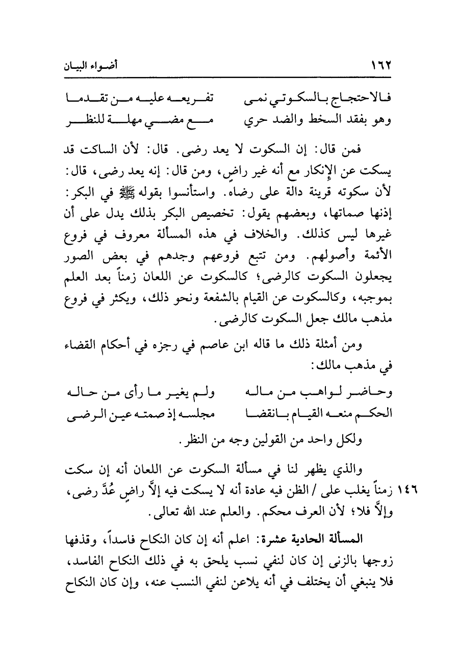 فمن قال: إن السكوت لا يعد رضى. قال: لأن الساكت قد يسكت عن الإِنكار مع أنَّه غير راضٍ، ومن قال: إنه يعد رضى، قال: لأن سكوته قرينة دالة على رضاه. واستأنسوا بقوله - صلى الله عليه وسلم - في البكر: إذنها صماتها، وبعضهم يقول: تخصيص البكر بذلك يدل على أن غيرها ليس كذلك. والخلاف في هذه المسألة معروف في فروع الأئمة وأصولهم. ومن تتبع فروعهم وجدهم في بعض الصور يجعلون السكوت كالرضى؛ كالسكوت عن اللعان زمنًا بعد العلم بموجبه، وكالسكوت عن القيام بالشفعة ونحو ذلك، ويكثر في فروع مذهب مالك جعل السكوت كالرضى.