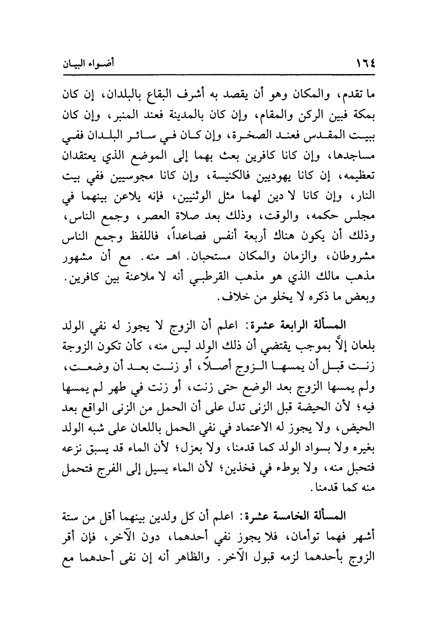 ما تقدم، والمكان وهو أن يقصد به أشرف البقاع بالبلدان، إن كان بمكة فبين الركن والمقام، وإن كان بالمدينة فعند المنبر، وإن كان ببيت المقدس فعند الصخرة، وإن كان في سائر البلدان ففي مساجدها، وإن كانا كافرين بعث بهما إلى الموضع الذي يعتقدان تعظيمه، إن كانا يهوديين فالكنيسة، وإن كانا مجوسيين ففي بيت النار، وإن كانا لا دين لهما مثل الوثنيين، فإنه يلاعن بينهما في مجلس حكمه، والوقت، وذلك بعد صلاة العصر، وجمع الناس، وذلك أن يكون هناك أربعة أنفس فصاعدًا، فاللفظ وجمع الناس مشروطان، والزمان والمكان مستحبان. اهـ منه. مع أن مشهور مذهب مالك الذي هو مذهب القرطبي أنَّه لا ملاعنة بين كافرين. وبعض ما ذكره لا يخلو من خلاف.