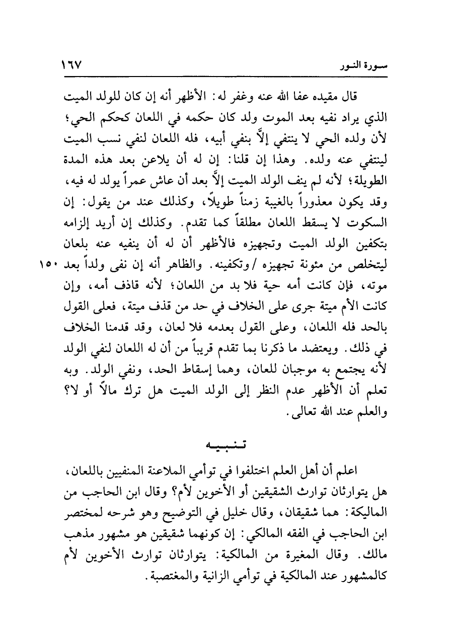 اعلم أن أهل العلم اختلفوا في توأمي الملاعنة المنفيين باللعان، هل يتوارثان توارث الشقيقين أو الأخوين لأم؟ وقال ابن الحاجب من الماليكة: هما شقيقان، وقال خليل في التوضيح وهو شرحه لمختصر ابن الحاجب في الفقه المالكي: إن كونهما شقيقين هو مشهور مذهب مالك. وقال المغيرة من المالكية: يتوارثان توارث الأخوين لأم كالمشهور عند المالكية في توأمي الزانية والمغتصبة.