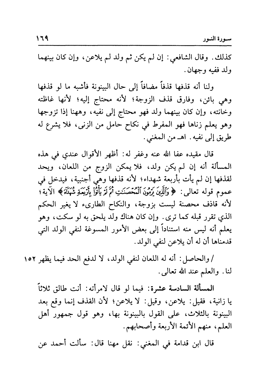 المسألة السادسة عشرة: فيما لو قال لامرأته: أنت طالق ثلاثًا يا زانية، فقيل: يلاعن، وقيل: لا يلاعن؛ لأن القذف إنما وقع بعد البينونة بالثلاث، على القول بالبينونة بها، وهو قول جمهور أهل العلم، منهم الأئمة الأربعة وأصحابهم.
