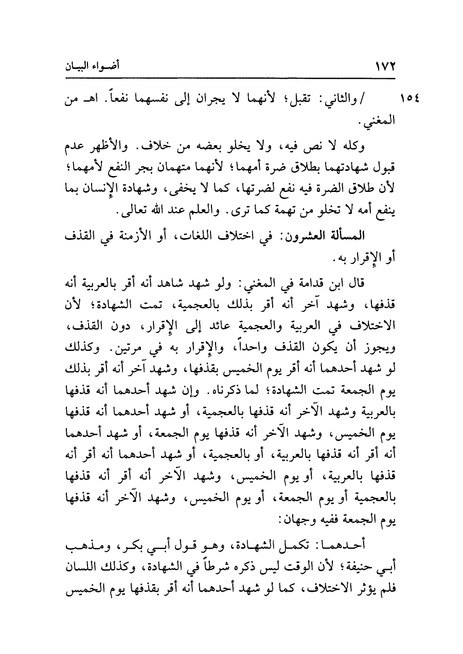 قال ابن قدامة في المغني: ولو شهد شاهد أنَّه أقر بالعربية أنَّه قذفها، وشهد آخر أنَّه أقر بذلك بالعجمية، تمت الشهادة، لأن الاختلاف في العربية والعجمية عائد إلى الإِقرار، دون القذف، ويجوز أن يكون القذف واحدًا، والإِقرار به في مرتين. وكذلك لو شهد أحدهما أنَّه أقر يوم الخميس بقذفها، وشهد آخر أنَّه أقر بذلك يوم الجمعة تمت الشهادة، لما ذكرناه. وإن شهد أحدهما أنَّه قذفها بالعربية وشهد الآخر أنَّه قذفها بالعجمية، أو شهد أحدهما أنَّه قذفها يوم الخميس، وشهد الآخر أنَّه قذفها يوم الجمعة، أو شهد أحدهما أنَّه أقر أنَّه قذفها بالعربية، أو بالعجمية، أو شهد أحدهما أنَّه أقر أنَّه قذفها بالعربية، أو يوم الخميس، وشهد الآخر أنَّه أقر أنَّه قذفها بالعجمية أو يوم الجمعة، أو يوم الخميس، وشهد الآخر أنَّه قذفها يوم الجمعة ففيه وجهان: