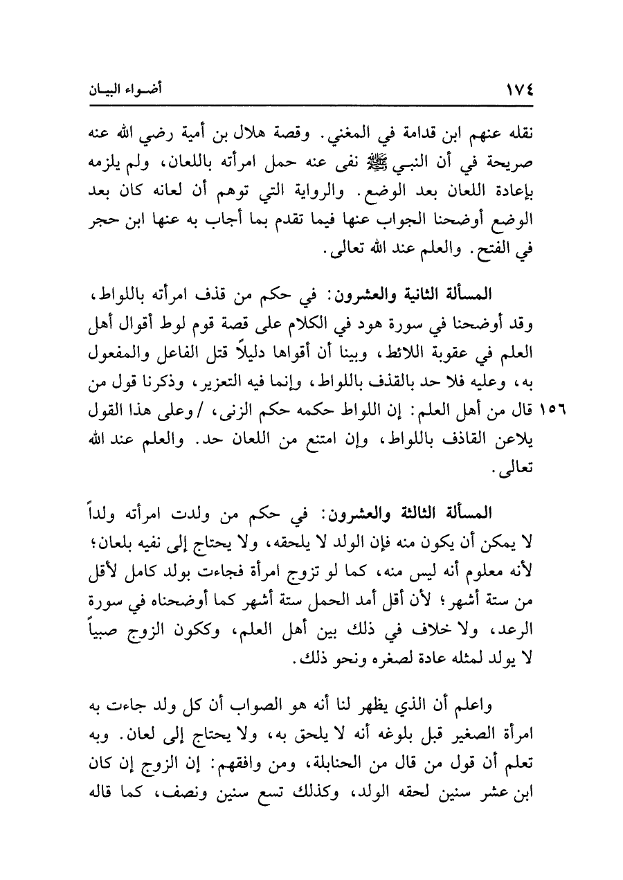 المسألة الثانية والعشرون: في حكم من قذف امرأته باللواط، وقد أوضحنا في سورة هود في الكلام على قصة قوم لوط أقوال أهل العلم في عقوبة اللائط، وبينا أن أقواها دليلًا قتل الفاعل والمفعول به، وعليه فلا حد بالقذف باللواط، وإنما فيه التعزير، وذكرنا قول من قال من أهل العلم: إن اللواط حكمه حكم الزنى، وعلى هذا القول يلاعن القاذف باللواط، وإن امتنع من اللعان حد. والعلم عند الله تعالى.