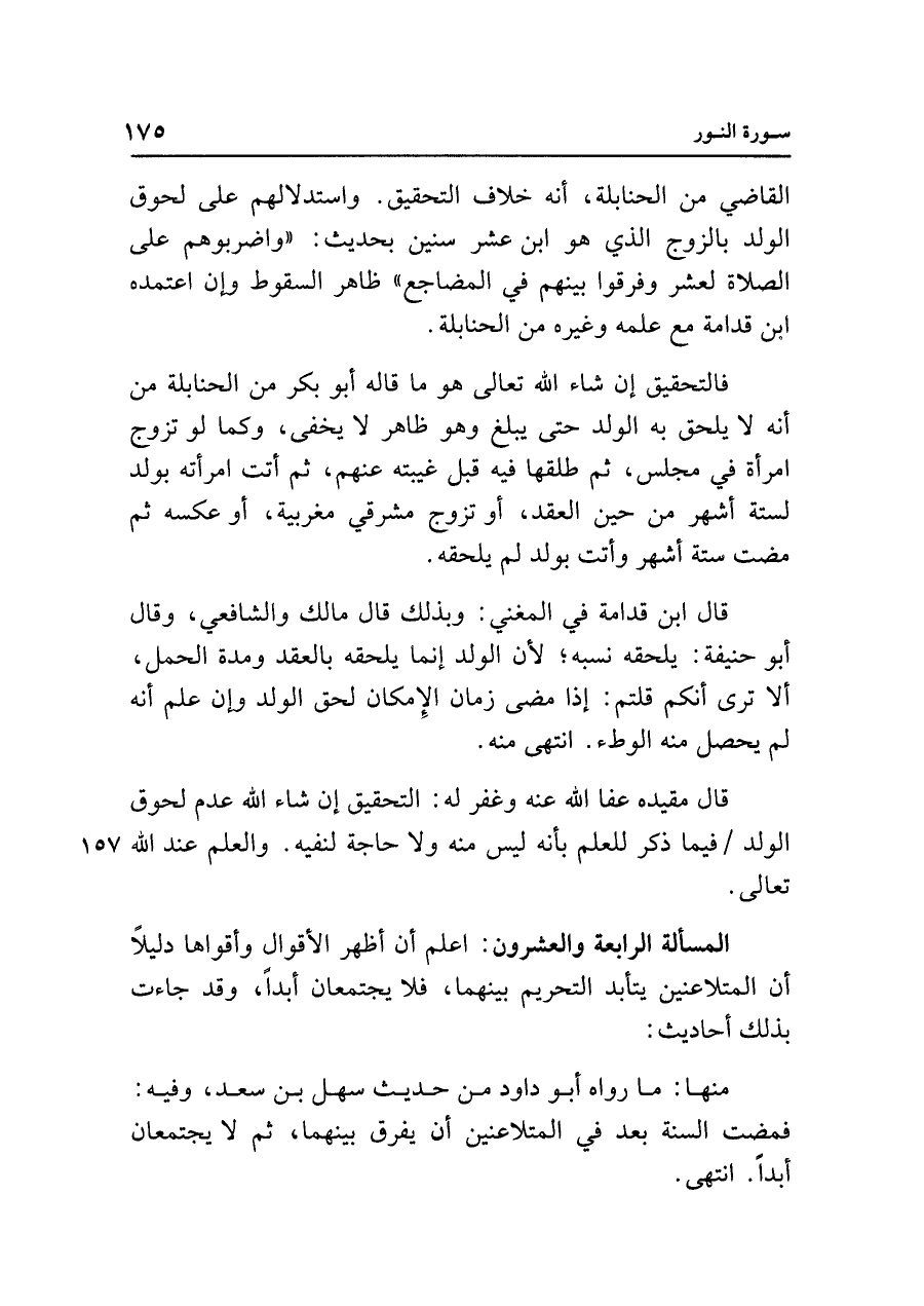 فالتحقيق إن شاء الله تعالى هو ما قاله أَبو بكر من الحنابلة من أنَّه لا يلحق به الولد حتى يبلغ وهو ظاهر لا يخفى، وكما لو تزوج امرأة في مجلس، ثم طلقها فيه قبل غيبته عنهم، ثم أتت امرأته بولد لستة أشهر من حين العقد، أو تزوج مشرقي مغربية، أو عكسه ثم مضت ستة أشهر وأتت بولد لم يلحقه.