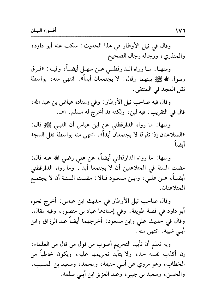 ومنها: ما رواه الدارقطني عن ابن عباس أن النبي - صلى الله عليه وسلم - قال: "المتلاعنان إذا تفرقا لا يجتمعان أبدًا". انتهى منه بواسطة نقل المجد أيضًا.