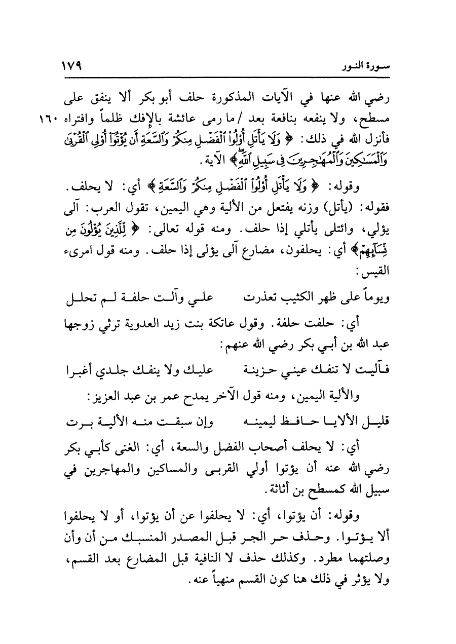 وقوله: {وَلَا يَأْتَلِ أُولُو الْفَضْلِ مِنْكُمْ وَالسَّعَةِ} أي: لا يحلف. فقوله: (يأتل) وزنه يفتعل من الألية وهي اليمين، تقول العرب: آلى يؤلي، وائتلى يأتلي إذا حلف. ومنه قوله تعالى: {لِلَّذِينَ يُؤْلُونَ مِنْ نِسَائِهِمْ} أي: يحلفون، مضارع آلى يؤلى إذا حلف. ومنه قول امرئ القيس: