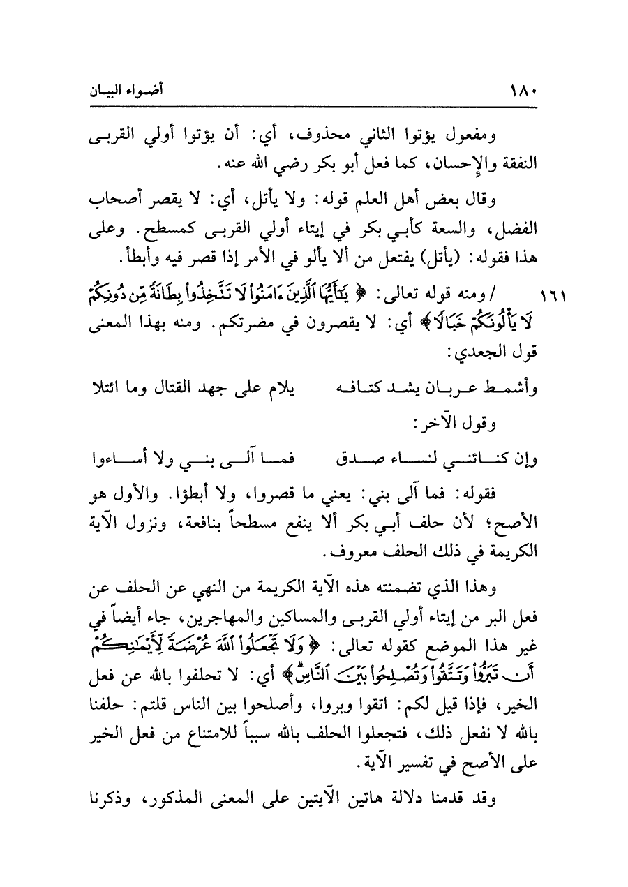 وهذا الذي تضمنته هذه الآية الكريمة من النهي عن الحلف عن فعل البر من إيتاء أولي القربى والمساكين والمهاجرين، جاء أيضًا في غير هذا الموضع كقوله تعالى: {وَلَا تَجْعَلُوا اللَّهَ عُرْضَةً لِأَيْمَانِكُمْ أَنْ تَبَرُّوا وَتَتَّقُوا وَتُصْلِحُوا بَيْنَ النَّاسِ} أي: لا تحلفوا باللَّه عن فعل الخير، فإذا قيل لكم: اتقوا وبروا، وأصلحوا بين الناس قلتم: حلفنا باللَّه لا نفعل ذلك، فتجعلوا الحلف باللَّه سببًا للامتناع من فعل الخير على الأصح في تفسير الآية.