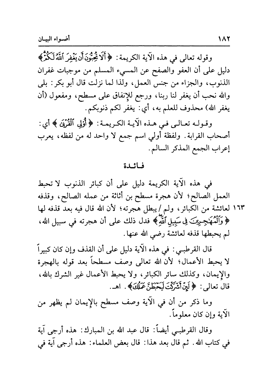 في هذه الآية الكريمة دليل على أن كبائر الذنوب لا تحبط العمل الصالح؛ لأن هجرة مسطح بن أثاثة من عمله الصالح، وقذفه لعائشة من الكبائر، ولم يبطل هجرته؛ لأن الله قال فيه بعد قذفه لها {وَالْمُهَاجِرِينَ فِي سَبِيلِ اللَّهِ} فدل ذلك على أن هجرته في سبيل الله، لم يحبطها قذفه لعائشة رضي الله عنها.
