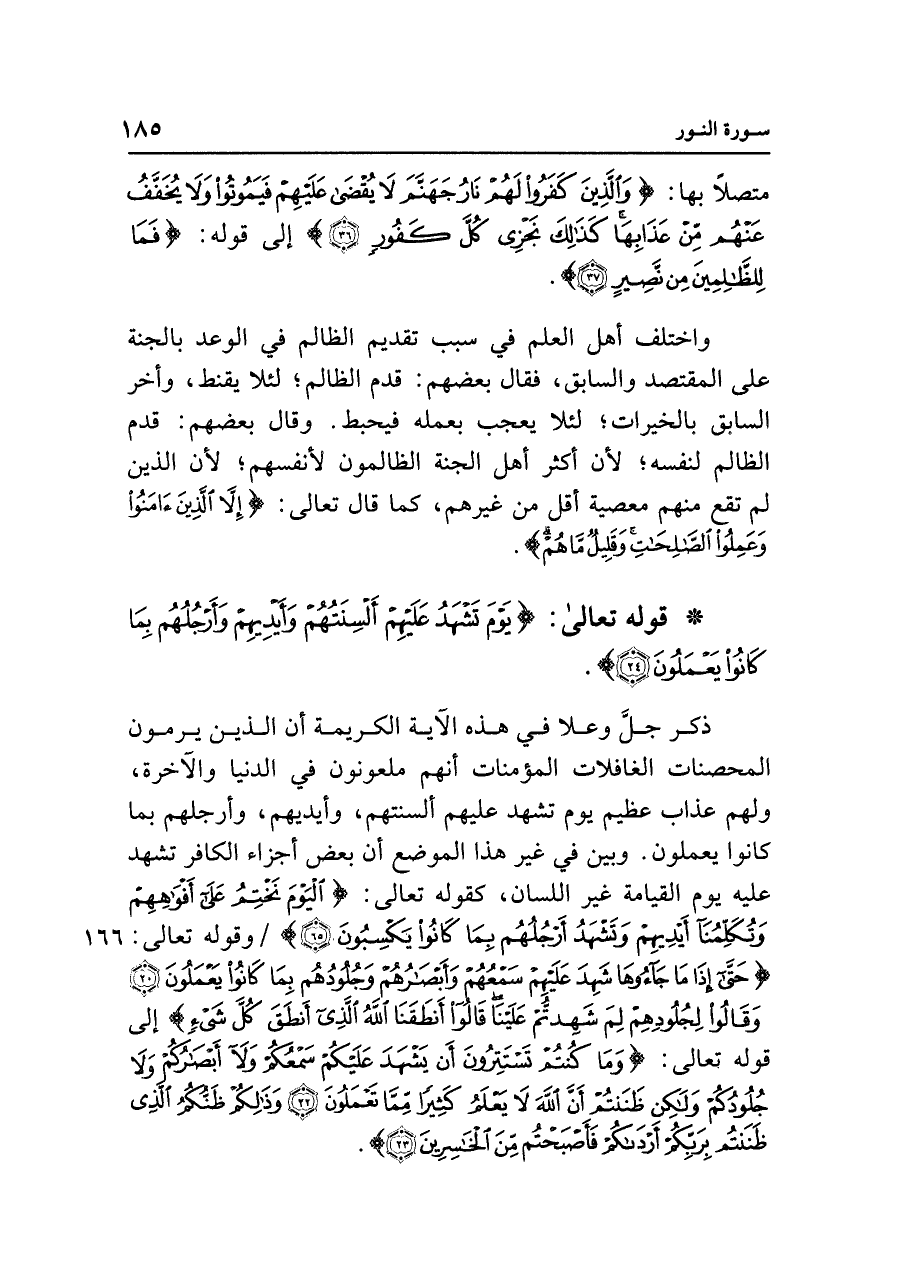 ذكر جلَّ وعلا في هذه الآية الكريمة أن الذين يرمون المحصنات الغافلات المؤمنات أنهم ملعونون في الدنيا والآخرة، ولهم عذاب عظيم يوم تشهد عليهم ألسنتهم، وأيديهم، وأرجلهم بما كانوا يعملون. وبين في غير هذا الموضع أن بعض أجزاء الكافر تشهد عليه يوم القيامة غير اللسان، كقوله تعالى: {الْيَوْمَ نَخْتِمُ عَلَى أَفْوَاهِهِمْ وَتُكَلِّمُنَا أَيْدِيهِمْ وَتَشْهَدُ أَرْجُلُهُمْ بِمَا كَانُوا يَكْسِبُونَ (٦٥)} وقوله تعالى: {حَتَّى إِذَا مَا جَاءُوهَا شَهِدَ عَلَيْهِمْ سَمْعُهُمْ وَأَبْصَارُهُمْ وَجُلُودُهُمْ بِمَا كَانُوا يَعْمَلُونَ (٢٠) وَقَالُوا لِجُلُودِهِمْ لِمَ شَهِدْتُمْ عَلَيْنَا قَالُوا أَنْطَقَنَا اللَّهُ الَّذِي أَنْطَقَ كُلَّ شَيْءٍ} إلى قوله تعالى: {وَمَا كُنْتُمْ تَسْتَتِرُونَ أَنْ يَشْهَدَ عَلَيْكُمْ سَمْعُكُمْ وَلَا أَبْصَارُكُمْ وَلَا جُلُودُكُمْ وَلَكِنْ ظَنَنْتُمْ أَنَّ اللَّهَ لَا يَعْلَمُ كَثِيرًا مِمَّا تَعْمَلُونَ (٢٢) وَذَلِكُمْ ظَنُّكُمُ الَّذِي ظَنَنْتُمْ بِرَبِّكُمْ أَرْدَاكُمْ فَأَصْبَحْتُمْ مِنَ الْخَاسِرِينَ (٢٣)}.