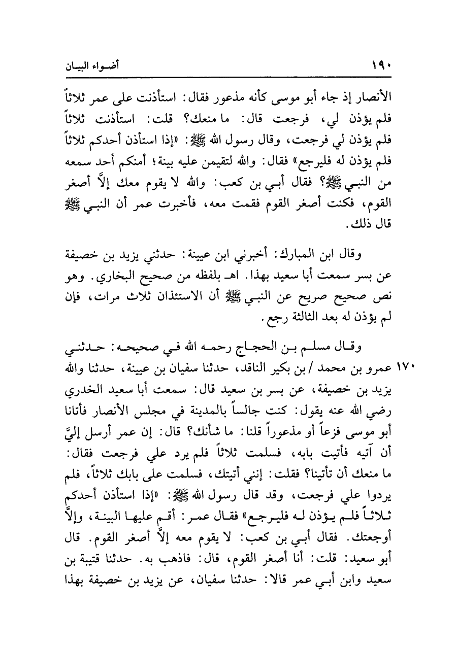 وقال مسلم بن الحجاج رحمه الله في صحيحه: حدثني عمرو بن محمد بن بكير الناقد، حدثنا سفيان بن عيينة، حدثنا واللَّه يزيد بن خصيفة، عن بسر بن سعيد قال: سمعت أبا سعيد الخدري رضي الله عنه يقول: كنت جالسًا بالمدينة في مجلس الأنصار فأتانا أبو موسى فزعًا أو مذعورًا قلنا: ما شأنك؟ قال: إن عمر أرسل إليَّ أن آتيه فأتيت بابه، فسلمت ثلاثًا فلم يرد عليّ فرجعت فقال: ما منعك أن تأتينا؟ فقلت: إنني أتيتك، فسلمت على بابك ثلاثًا، فلم يردوا عليّ فرجعت، وقد قال رسول الله - صلى الله عليه وسلم - : "إذا استأذن أحدكم ثلاثًا فلم يؤذن له فليرجع" فقال عمر: أقم عليها البينة، وإلَّا أوجعتك. فقال أبي بن كعب: لا يقوم معه إلَّا أصغر القوم. قال أبو سعيد: قلت: أنا أصغر القوم، قال: فاذهب به. حدثنا قتيبة بن سعيد وابن أبي عمر قالا: حدثنا سفيان، عن يزيد بن خصيفة بهذا