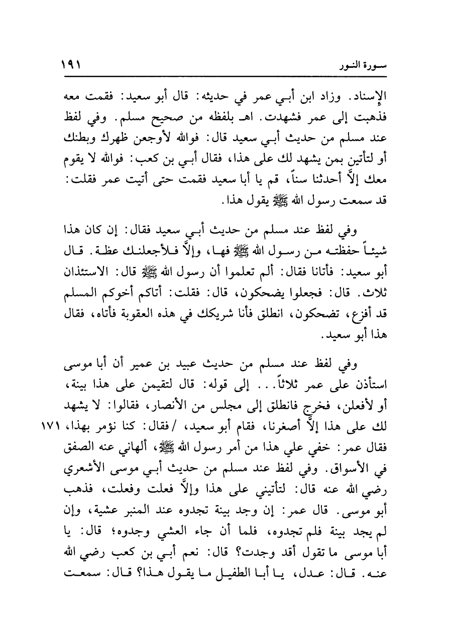 الإِسناد. وزاد ابن أبي عمر في حديثه: قال أبو سعيد: فقمت معه فذهبت إلى عمر فشهدت. اهـ بلفظه من صحيح مسلم. وفي لفظ عند مسلم من حديث أبي سعيد قال: فواللَّه لأوجعن ظهرك وبطنك أو لتأتين بمن يشهد لك على هذا، فقال أبي بن كعب: فواللَّه لا يقوم معك إلَّا أحدثنا سنًا، قم يا أبا سعيد فقمت حتى أتيت عمر فقلت: قد سمعت رسول الله - صلى الله عليه وسلم - يقول هذا.
