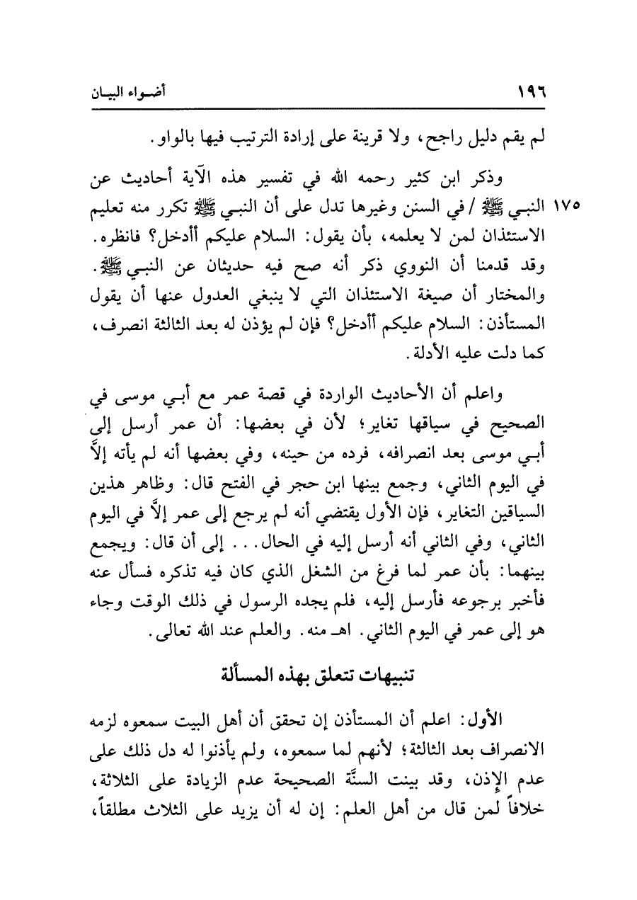 الأول: اعلم أن المستأذن إن تحقق أن أهل البيت سمعوه لزمه الانصراف بعد الثالثة؛ لأنهم لما سمعوه، ولم يأذنوا له دل ذلك على عدم الإِذن، وقد بينت السنَّة الصحيحة عدم الزيادة على الثلاثة، خلافًا لمن قال من أهل العلم: إن له أن يزيد على الثلاث مطلقًا،