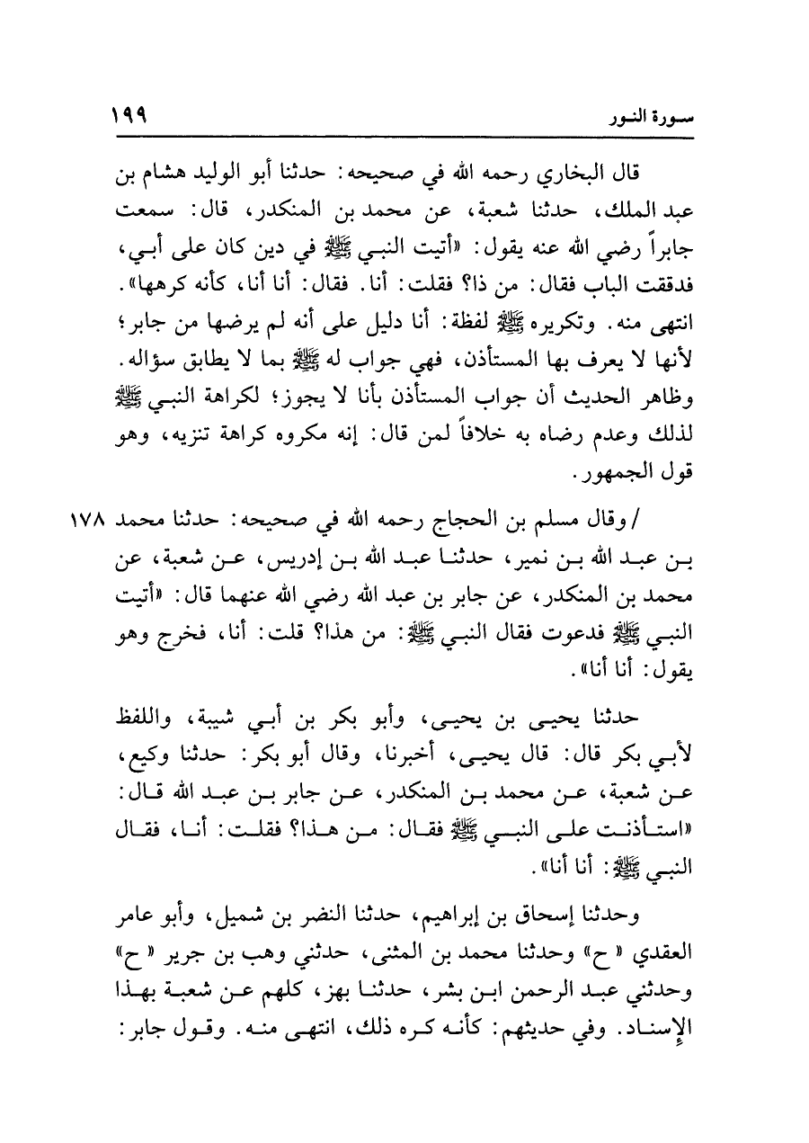 وقال مسلم بن الحجاج رحمه الله في صحيحه: حدثنا محمد بن عبد الله بن نمير، حدثنا عبد الله بن إدريس، عن شعبة، عن محمد بن المنكدر، عن جابر بن عبد الله رضي الله عنهما قال: "أتيت النبي - صلى الله عليه وسلم - فدعوت فقال النبي - صلى الله عليه وسلم - : من هذا؟ قلت: أنا، فخرج وهو يقول: أنا أنا".