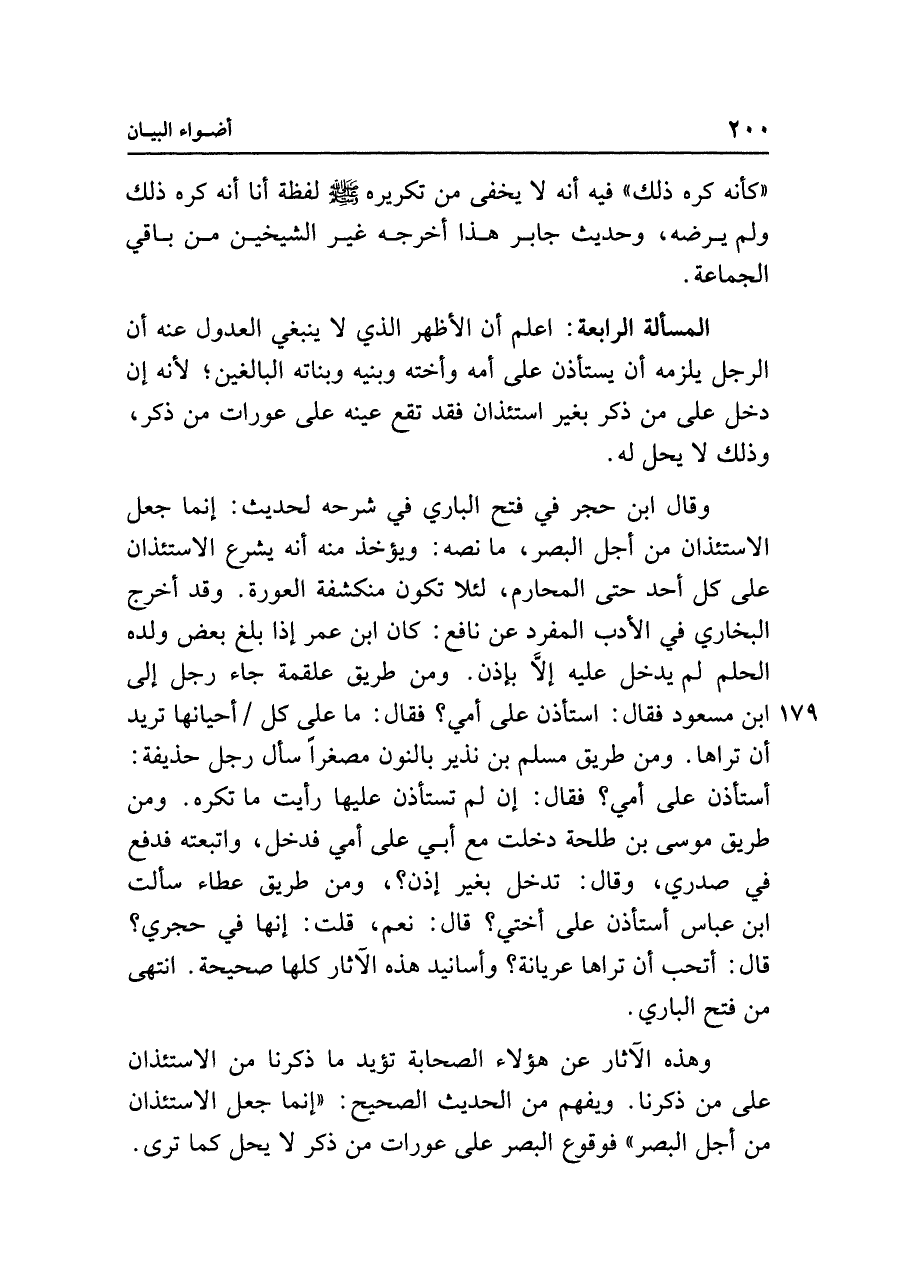 وقال ابن حجر في فتح الباري في شرحه لحديث: إنما جعل الاستئذان من أجل البصر، ما نصه: ويؤخذ منه أنه يشرع الاستئذان على كل أحد حتى المحارم، لئلا تكون منكشفة العورة. وقد أخرج البخاري في الأدب المفرد عن نافع: كان ابن عمر إذا بلغ بعض ولده الحلم لم يدخل عليه إلَّا بإذن. ومن طريق علقمة جاء رجل إلى ابن مسعود فقال: استأذن على أمي؟ فقال. ما على كل أحيانها تريد أن تراها. ومن طريق مسلم بن نذير بالنون مصغرًا سأل رجل حذيفة: أستأذن على أمي؟ فقال: إن لم تستأذن عليها رأيت ما تكره. ومن طريق موسى بن طلحة دخلت مع أبي على أمي فدخل، واتبعته فدفع في صدري، وقال: تدخل بغير إذن؟، ومن طريق عطاء سألت ابن عباس أستأذن على أختي؟ قال: نعم، قلت: إنها في حجري؟ قال: أتحب أن تراها عريانة؟ وأسانيد هذه الآثار كلها صحيحة. انتهى من فتح الباري.