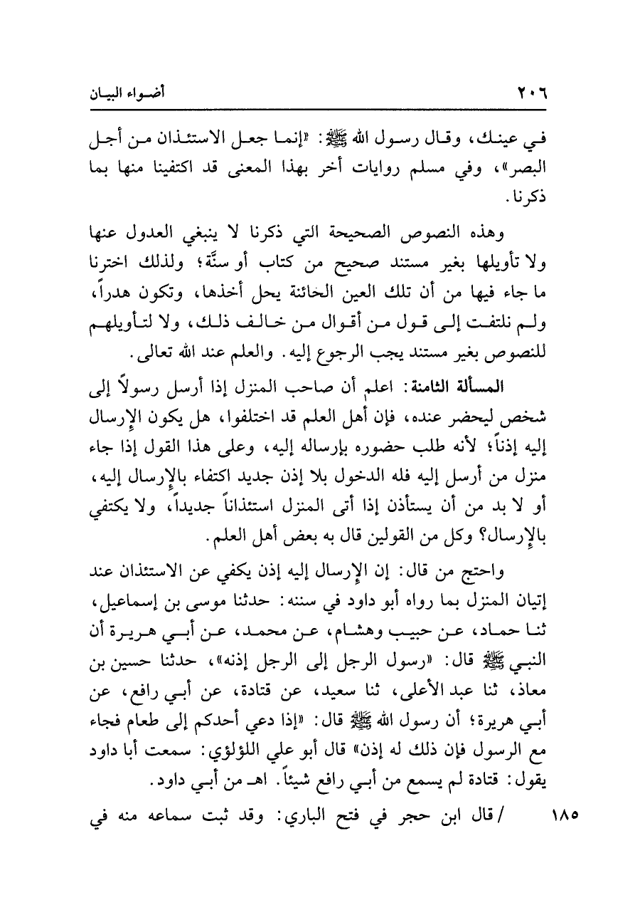المسألة الثامنة: اعلم أن صاحب المنزل إذا أرسل رسولًا إلى شخص ليحضر عنده، فإن أهل العلم قد اختلفوا، هل يكون الإِرسال إليه إذنًا؛ لأنه طلب حضوره بإرساله إليه، وعلى هذا القول إذا جاء منزل من أرسل إليه فله الدخول بلا إذن جديد اكتفاء بالإِرسال إليه، أو لا بد من أن يستأذن إذا أتي المنزل استئذانًا جديدًا، ولا يكتفي بالإِرسال؟ وكل من القولين قال به بعض أهل العلم.