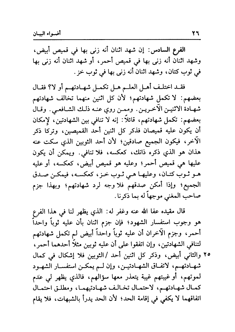 قال مقيده عفا الله عنه وغفر له: الذي يظهر لنا في هذا الفرع هو وجوب استفسار الشهود؛ فإن جزم اثنان بأن عليه ثوبًا واحدًا أحمر، وجزم الآخران أن عليه ثوبًا واحدًا أبيض لم تكمل شهادتهم لتنافي الشهادتين، وإن اتفقوا على أن عليه ثوبين مثلًا أحدهما أحمر، والثاني أبيض، وذكر كل اثنين أحد الثوبين فلا إشكال في كمال شهادتهم، لاتفاق الشهادتين، وإن لم يمكن استفسار الشهود لموتهم، أو غيبتهم غيبة يتعذر معها سؤالهم، فالذي يظهر لي عدم كمال شهادتهم، لاحتمال تخالف شهادتيهما، ومطلق احتمال اتفاقهما لا يكفي في إقامة الحد؛ لأن الحد يدرأ بالشبهات، فلا يقام