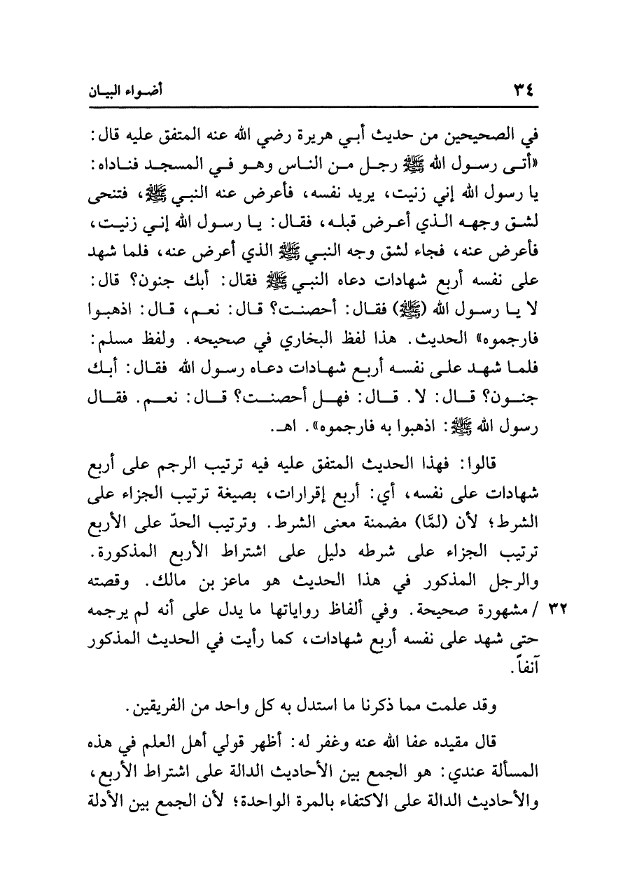 قالوا: فهذا الحديث المتفق عليه فيه ترتيب الرجم على أربع شهادات على نفسه، أي: أربع إقرارات، بصيغة ترتيب الجزاء على الشرط؛ لأن (لمَّا) مضمنة معنى الشرط. وترتيب الحدّ على الأربع ترتيب الجزاء على شرطه دليل على اشتراط الأربع المذكورة. والرجل المذكور في هذا الحديث هو ماعز بن مالك. وقصته مشهورة صحيحة. وفي ألفاظ رواياتها ما يدل على أنه لم يرجمه حتى شهد على نفسه أربع شهادات، كما رأيت في الحديث المذكور آنفًا.
