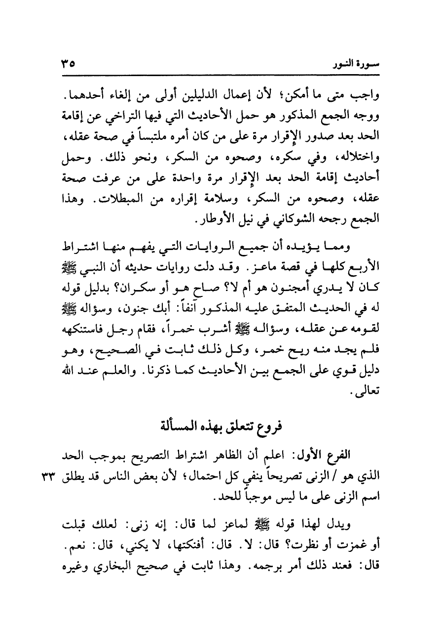 الفرع الأول: اعلم أن الظاهر اشتراط التصريح بموجب الحد الذي هو الزنى تصريحًا ينفي كل احتمال، لأن بعض الناس قد يطلق اسم الزنى على ما ليس موجبًا للحد.