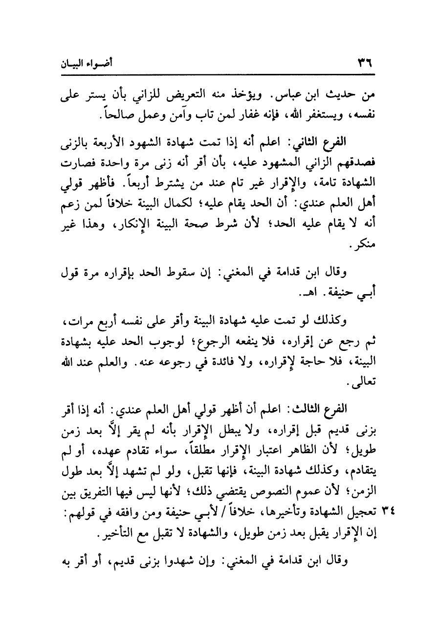 الفرع الثالث: اعلم أن أظهر قولي أهل العلم عندي: أنه إذا أقر بزنى قديم قبل إقراره، ولا يبطل الإِقرار بأنه لم يقر إلَّا بعد زمن طويل؛ لأن الظاهر اعتبار الإِقرار مطلقًا، سواء تقادم عهده، أو لم يتقادم، وكذلك شهادة البينة، فإنها تقبل، ولو لم تشهد إلَّا بعد طول الزمن؛ لأن عموم النصوص يقتضي ذلك؛ لأنها ليس فيها التفريق بين تعجيل الشهادة وتأخيرها، خلافًا لأبي حنيفة ومن وافقه في قولهم: إن الإِقرار يقبل بعد زمن طويل، والشهادة لا تقبل مع التأخير.