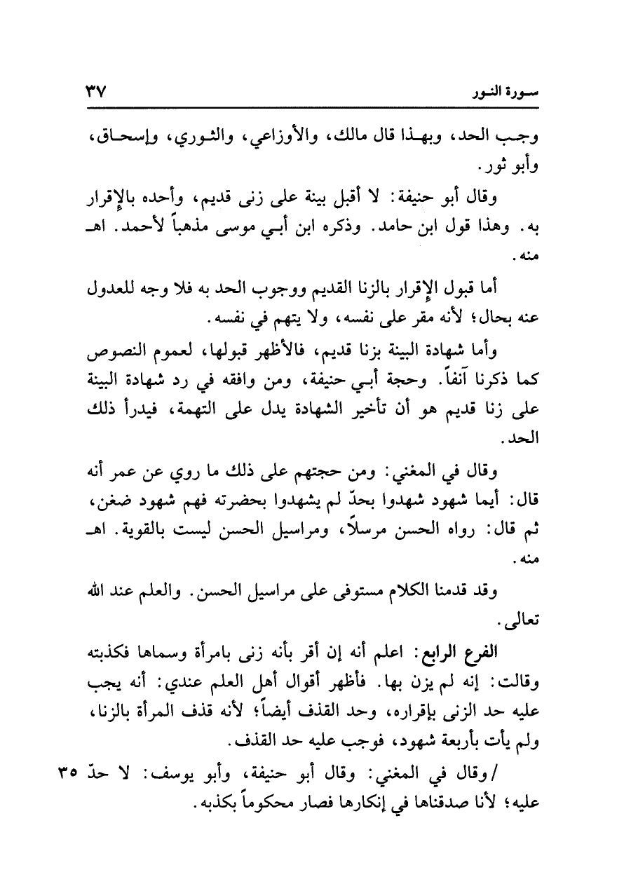 وقال في المغني: وقال أبو حنيفة، وأبو يوسف: لا حدّ عليه؛ لأنا صدقناها في إنكارها فصار محكومًا بكذبه.
