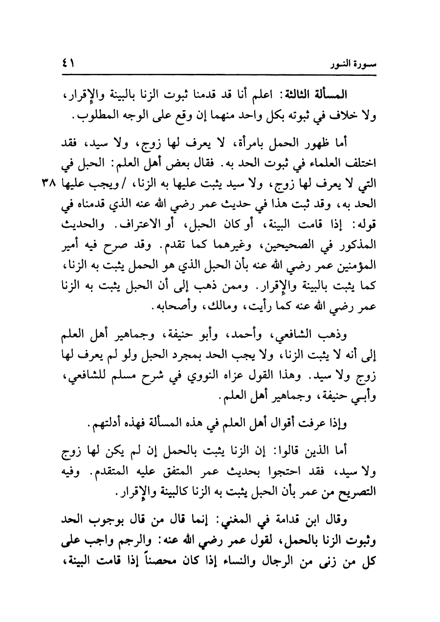 المسألة الثالثة: اعلم أنا قد قدمنا ثبوت الزنا بالبينة والإِقرار، ولا خلاف في ثبوته بكل واحد منهما إن وقع على الوجه المطلوب.