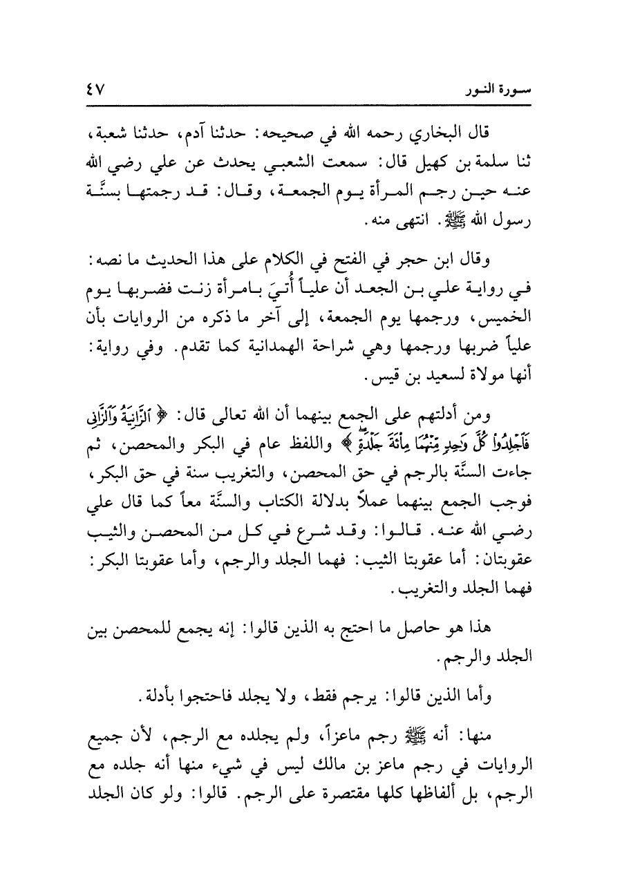 ومن أدلتهم على الجمع بينهما أن الله تعالى قال: {الزَّانِيَةُ وَالزَّانِي فَاجْلِدُوا كُلَّ وَاحِدٍ مِنْهُمَا مِائَةَ جَلْدَةٍ} واللفظ عام في البكر والمحصن، ثم جاءت السنَّة بالرجم في حق المحصن، والتغريب سنة في حق البكر، فوجب الجمع بينهما عملًا بدلالة الكتاب والسنَّة معًا كما قال علي رضي الله عنه. قالوا: وقد شرع في كل من المحصن والثيب عقوبتان: أما عقوبتا الثيب: فهما الجلد والرجم، وأما عقوبتا البكر: فهما الجلد والتغريب.