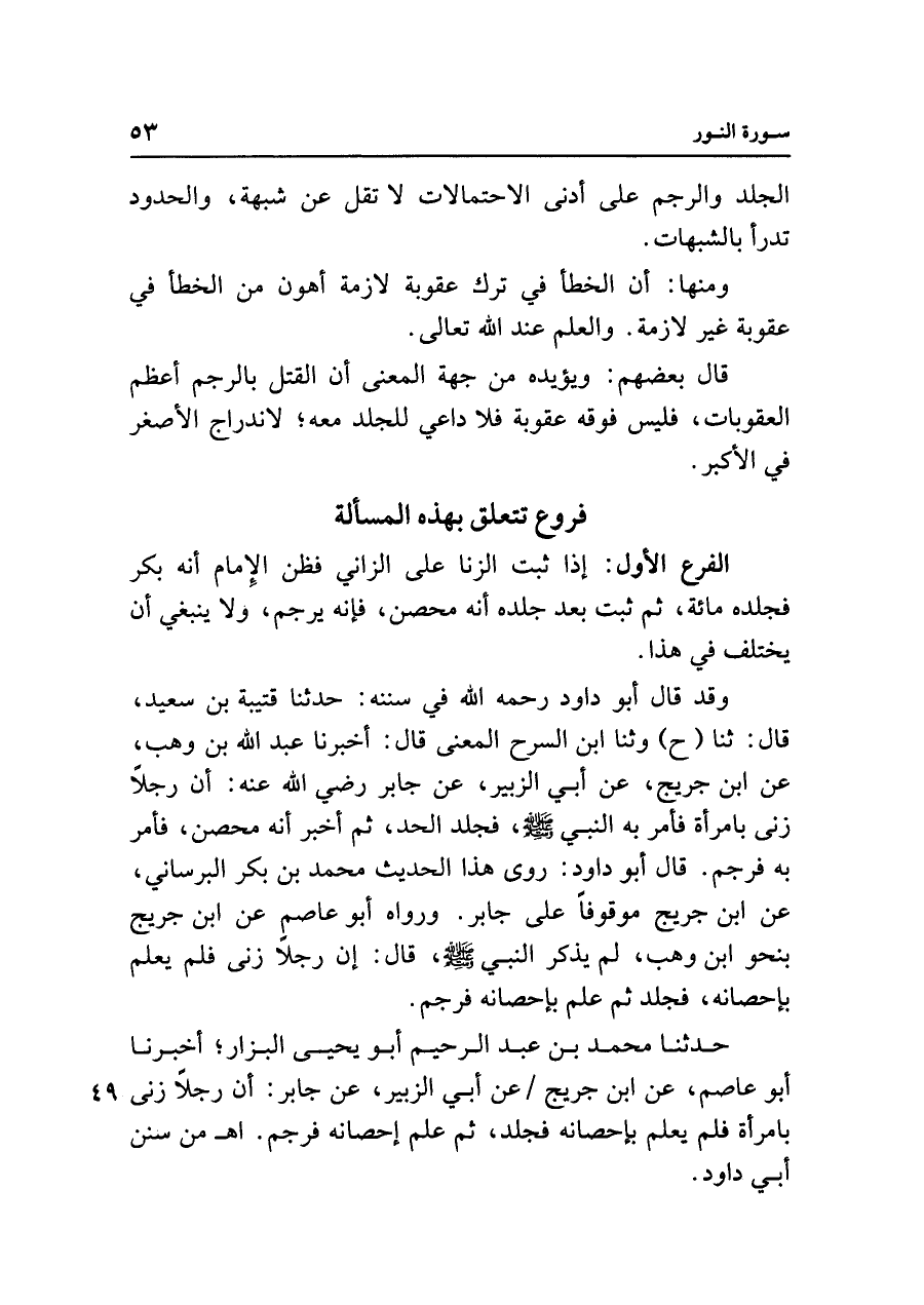 وقد قال أبو داود رحمه الله في سننه: حدثنا قتيبة بن سعيد، قال: ثنا (ح) وثنا ابن السرح المعنى قال: أخبرنا عبد الله بن وهب، عن ابن جريج، عن أبي الزبير، عن جابر رضي الله عنه: أن رجلًا زنى بامرأة فأمر به النبي - صلى الله عليه وسلم - ، فجلد الحد، ثم أخبر أنه محصن، فأمر به فرجم. قال أبو داود: روى هذا الحديث محمد بن بكر البرساني، عن ابن جريج موقوفًا على جابر. ورواه أبو عاصم عن ابن جريج بنحو ابن وهب، لم يذكر النبي - صلى الله عليه وسلم - ، قال: إن رجلًا زنى فلم يعلم بإحصانه، فجلد ثم علم بإحصانه فرجم.