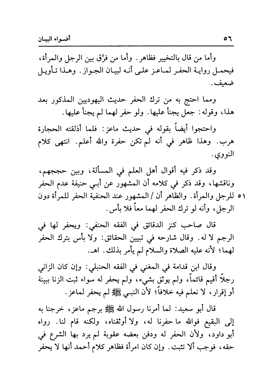 وأما من قال بالتخيير فظاهر. وأما من فرَّق بين الرجل والمرأة، فيحمل رواية الحفر لماعز على أنه لبيان الجواز. وهذا تأويل ضعيف.