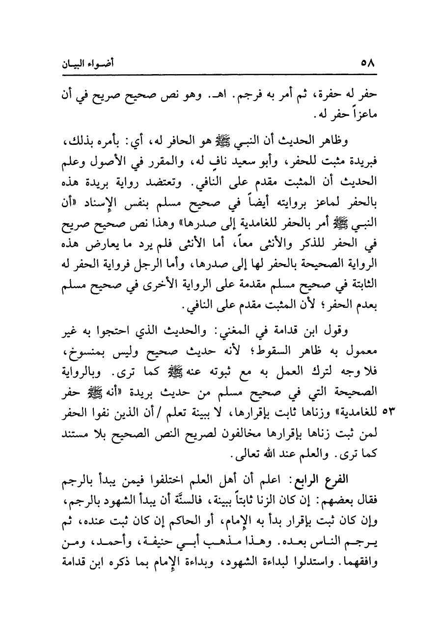 وظاهر الحديث أن النبي - صلى الله عليه وسلم - هو الحافر له، أي: بأمره بذلك، فبريدة مثبت للحفر، وأبو سعيد نافٍ له، والمقرر في الأصول وعلم الحديث أن المثبت مقدم على النافي. وتعتضد رواية بريدة هذه بالحفر لماعز بروايته أيضًا في صحيح مسلم بنفس الإِسناد "أن النبي - صلى الله عليه وسلم - أمر بالحفر للغامدية إلى صدرها" وهذا نص صحيح صريح في الحفر للذكر والأنثى معًا، أما الأنثى فلم يرد ما يعارض هذه الرواية الصحيحة بالحفر لها إلى صدرها، وأما الرجل فرواية الحفر له الثابتة في صحيح مسلم مقدمة على الرواية الأخرى في صحيح مسلم بعدم الحفر؛ لأن المثبت مقدم على النافي.