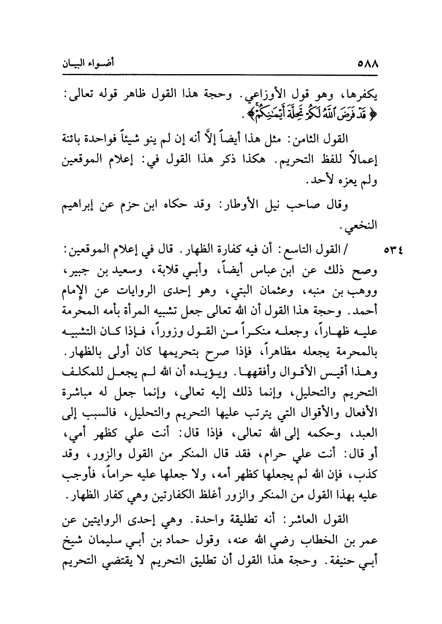 القول التاسع: أن فيه كفارة الظهار. قال في إعلام الموقعين: وصح ذلك عن ابن عباس أيضًا، وأبي قلابة، وسعيد بن جبير، ووهب بن منبه، وعثمان البتي، وهو إحدى الروايات عن الإِمام أحمد. وحجة هذا القول أن الله تعالى جعل تشبيه المرأة بأمه المحرمة عليه ظهارًا، وجعله منكرًا من القول وزورًا، فإذا كان التشبيه بالمحرمة يجعله مظاهرًا، فإذا صرح بتحريمها كان أولى بالظهار. وهذا أقيس الأقوال وأفقهها. ويؤيده أن الله لم يجعل للمكلف التحريم والتحليل، وإنما ذلك إليه تعالى، وإنما جعل له مباشرة الأفعال والأقوال التي يترتب عليها التحريم والتحليل، فالسبب إلى العبد، وحكمه إلى الله تعالى، فإذا قال: أنت علي كظهر أمي، أو قال: أنت علي حرام، فقد قال المنكر من القول والزور، وقد كذب، فإن الله لم يجعلها كظهر أمه، ولا جعلها عليه حرامًا، فأوجب عليه بهذا القول من المنكر والزور أغلظ الكفارتين وهي كفار الظهار.