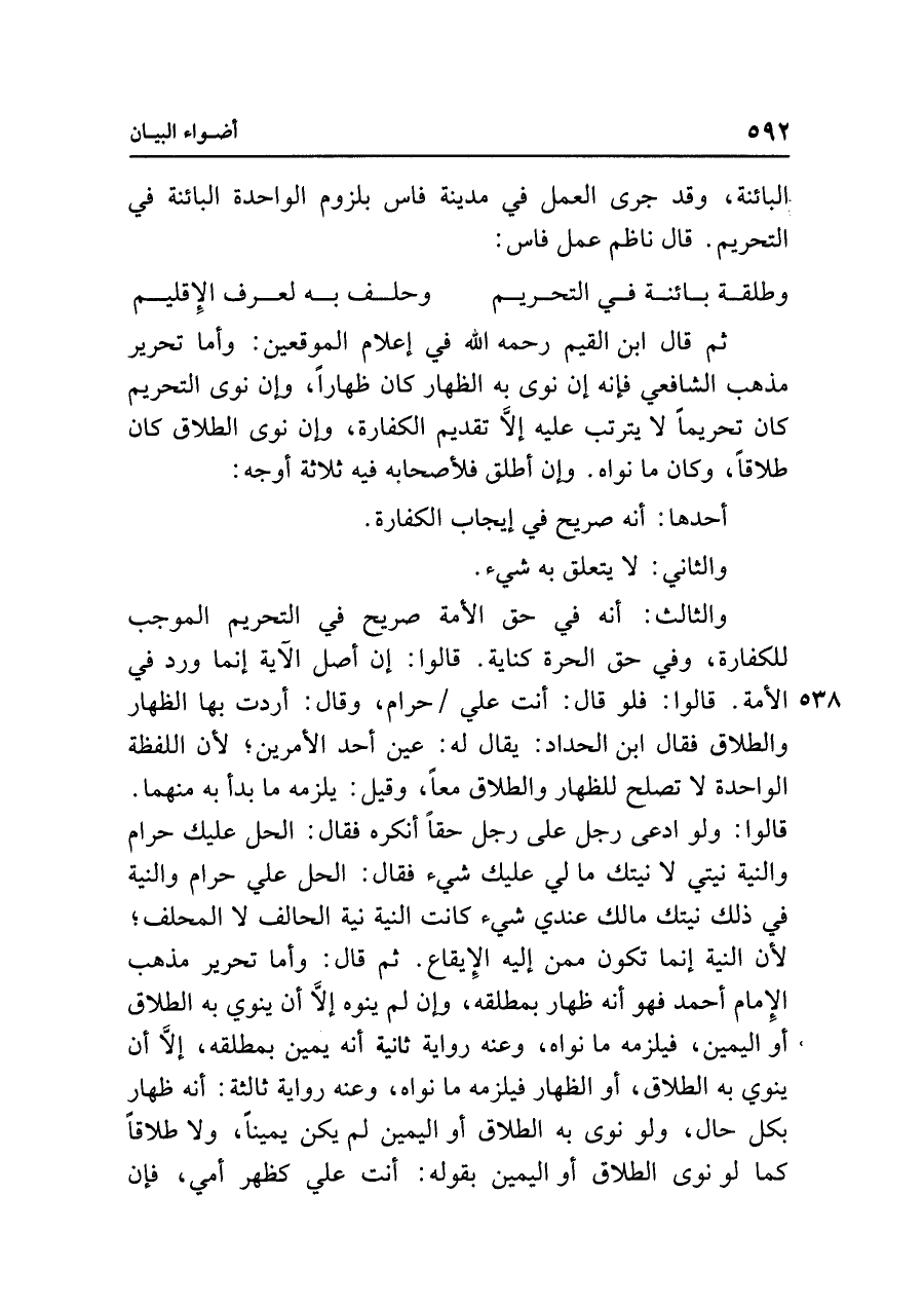والثالث: أنَّه في حق الأمة صريح في التحريم الموجب للكفارة، وفي حق الحرة كناية. قالوا: إن أصل الآية إنَّما ورد في الأمة. قالوا: فلو قال: أنت علي حرام، وقال: أردت بها الظهار والطلاق فقال ابن الحداد: يقال له: عين أحد الأمرين؛ لأنَّ اللفظة الواحدة لا تصلح للظهار والطلاق معًا، وقيل: يلزمه ما بدأ به منهما. قالوا: ولو ادعى رجل على رجل حقًا أنكره فقال: الحل عليك حرام والنية نيتي لا نيتك ما لي عليك شيء فقال: الحل علي حرام والنية في ذلك نيتك ما ك عندي شيء كانت النيَّة نيَّة الحالف لا المحلف؛ لأنَّ النيَّة إنَّما تكون ممن إليه الإِيقاع. ثم قال: وأما تحرير مذهب الإِمام أحمد فهو أنَّه ظهار بمطلقه، وإن لم ينوه إلَّا أن ينوي به الطلاق أو اليمين، فيلزمه ما نواه، وعنه رواية اثنية أنَّه يمين بمطلقه، إلَّا أن ينوي به الطلاق، أو الظهار فيلزمه ما نواه، وعنه رواية ثالثة: أنَّه ظهار بكلِّ حال، ولو نوى به الطلاق أو اليمين لم يكن يمينًا، ولا طلاقًا كما لو نوى الطلاق أو اليمين بقوله: أنت علي كظهر أمي، فإن
