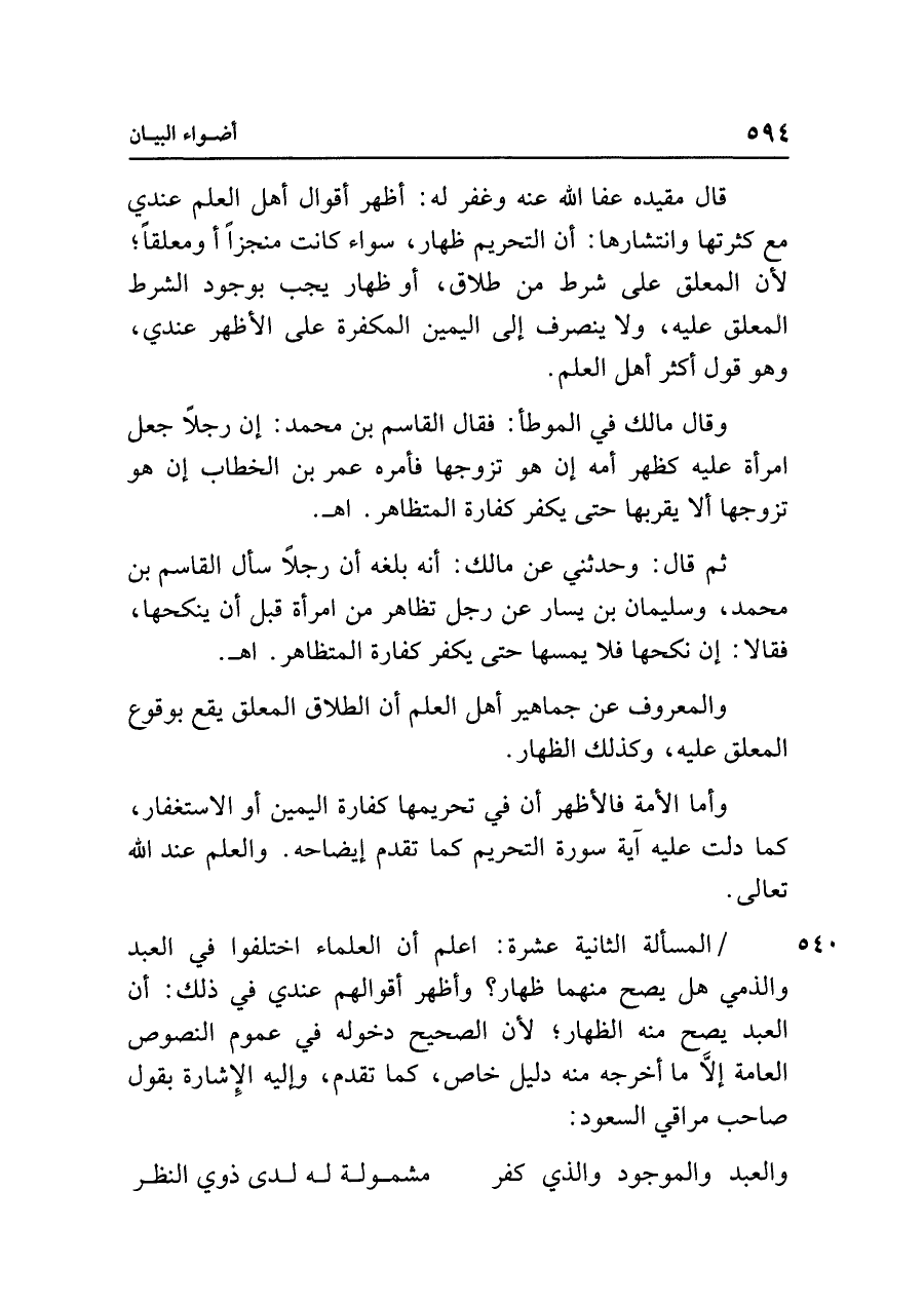 المسألة الثانية عشرة: أعلم أن العلماء اختلفوا في العبد والذمي هل يصح منهما ظهار؟ وأظهر أقوالهم عندي في ذلك: أن العبد يصح منه الظهار؛ لأنَّ الصَّحيح دخوله في عموم النصوص العامة إلّا ما أخرجه منه دليل خاص، كما تقدم، وإليه الإشارة بقول صاحب مراقي السعود: