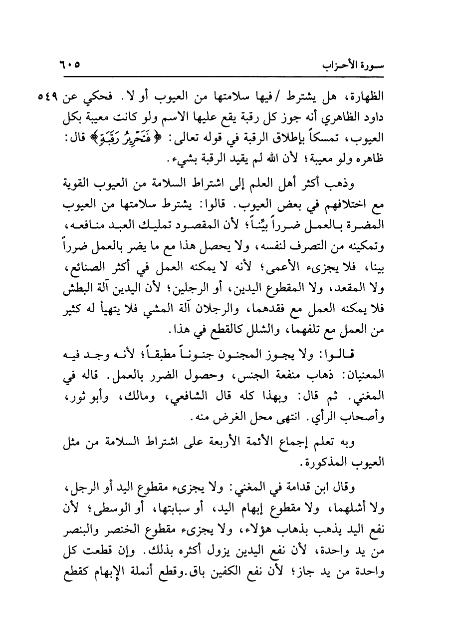الظهارة، هل يشترط فيها سلامتها من العيوب أو لا. فحكي عن داود الظاهري أنه جوز كل رقبة يقع عليها الاسم ولو كانت معيبة بكل العيوب، تمسكًا بإطلاق الرقبة في قوله تعالى: {فَتَحْرِيرُ رَقَبَةٍ} قال: ظاهره ولو معيبة؛ لأن الله لم يقيد الرقبة بشيء.