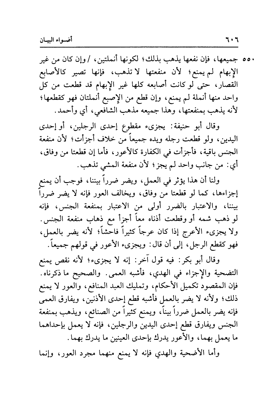 جميعها، فإن نفعها يذهب بذلك؛ لكونها أنملتين، وإن كان من غير الإِبهام لم يمنع؛ لأن منفعتها لا تذهب، فإنها تفسير كالأصابع القصار، حتى لو كانت أصابعه كلها غير الإِبهام قد قطعت من كل واحد منها أنملة لم يمنع، وإن قطع من الإِصبع أنملتان فهو كقطعها؛ لأنه يذهب بمنفعتها، وهذا جميعه مذهب الشافعي؛ أي وأحمد.