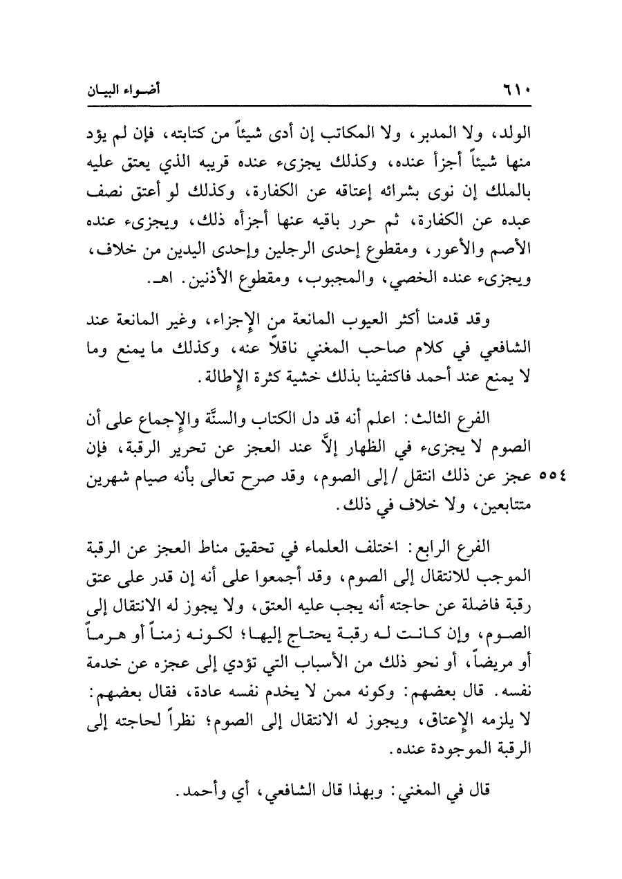 الفرع الرابع: اختلف العلماء في تحقيق مناط العجز عن الرقبة الموجب للانتقال إلى الصوم، وقد أجمعوا على أنه إن قدر على عتق رقبة فاضلة عن حاجته أنه يجب عليه العتق، ولا يجوز له الانتقال إلى الصوم، وإن كانت له رقبة يحتاج إليها؛ لكونه زمنًا أو هرمًا أو مريضًا، أو نحو ذلك من الأسباب التي تؤدي إلى عجزه عن خدمة نفسه. قال بعضهم: وكونه ممن لا يخدم نفسه عادة، فقال بعضهم: لا يلزمه الإِعتاق، ويجوز له الانتقال إلى الصوم؛ نظرًا لحاجته إلى الرقبة الموجودة عنده.