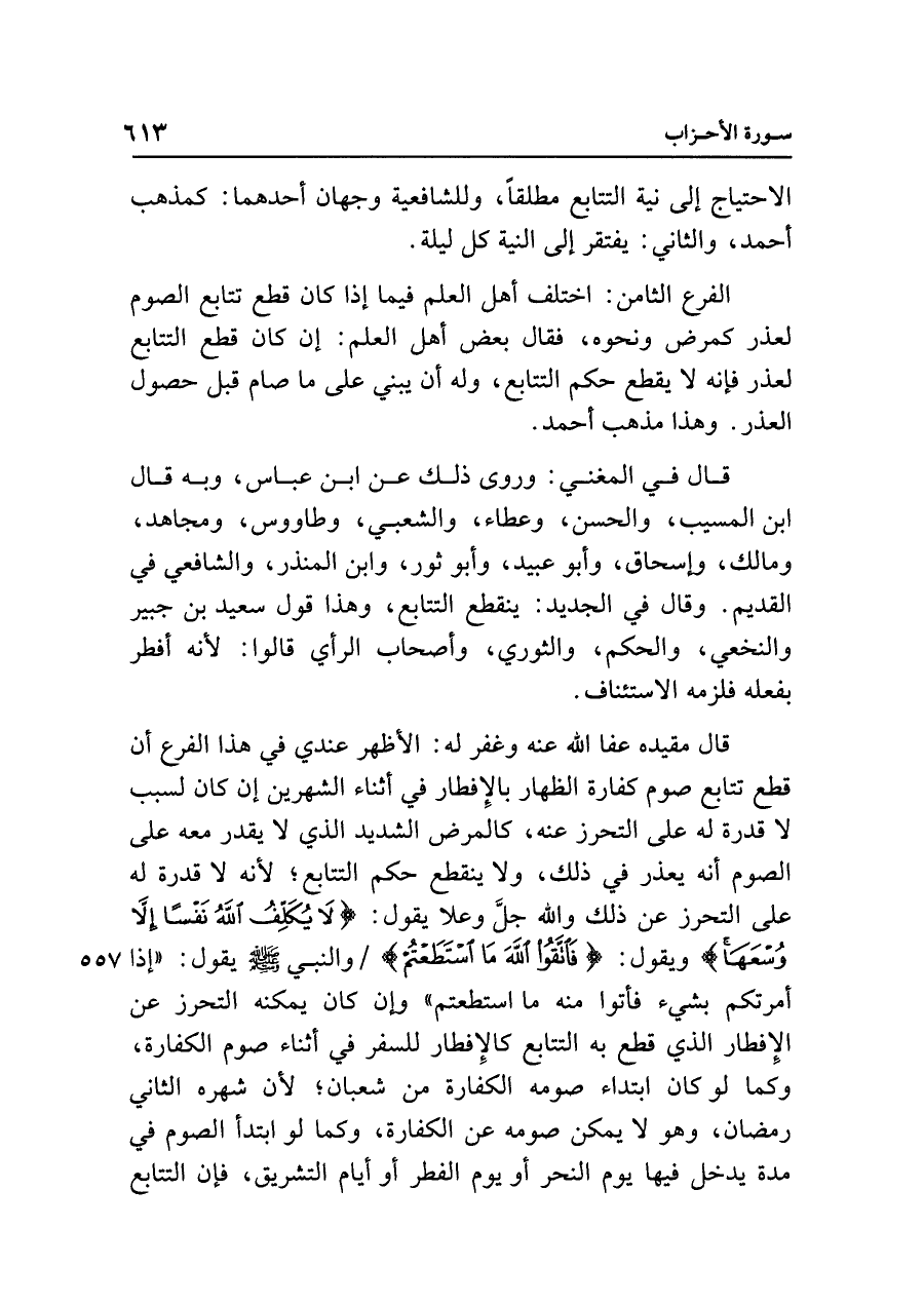 قال مقيده عفا الله عنه وغفر له: الأظهر عندي في هذا الفرع أن قطع تتابع صوم كفارة الظهار بالإِفطار في أثناء الشهرين إن كان لسبب لا قدرة له على التحرز عنه، كالمرض الشديد الذي لا يقدر معه على الصوم أنه يعذر في ذلك، ولا ينقطع حكم التتابع؛ لأنه لا قدرة له على التحرز عن ذلك واللَّه جلَّ وعلا يقول: {لَا يُكَلِّفُ اللَّهُ نَفْسًا إِلَّا وُسْعَهَا} ويقول: {فَاتَّقُوا اللَّهَ مَا اسْتَطَعْتُمْ} والنبي - صلى الله عليه وسلم - يقول: "إذ أمرتكم بشيء فأتوا منه ما استطعتم" وإن كان يمكنه التحرز عن الإِفطار الذي قطع به التتابع كالإِفطار للسفر في أثناء صوم الكفارة، وكما لو كان ابتداء صومه الكفارة من شعبان؛ لأن شهره الثاني رمضان، وهو لا يمكن صومه عن الكفارة، وكما لو ابتدأ الصوم في مدة يدخل فيها يوم النحر أو يوم الفطر أو أيام التشريق، فإن التتابع