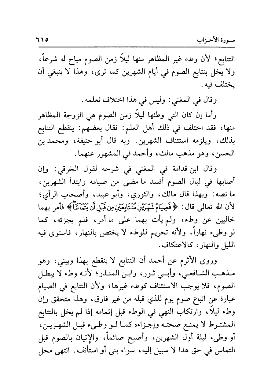 وقال ابن قدامة في المغني في شرحه لقول الخرقي: وإن أصابها في ليال الصوم أفسد ما مضى من صيامه وابتدأ الشهرين، ما نصه: وبهذا قال مالك، والثوري، وأبو عبيد، وأصحاب الرأي، لأن الله تعالى قال: {فَصِيَامُ شَهْرَيْنِ مُتَتَابِعَيْنِ مِنْ قَبْلِ أَنْ يَتَمَاسَّا} فأمر بهما خاليين عن وطء، ولم يأت بهما على ما أمر، فلم يجزئه، كما لو وطئ نهارًا، ولأنه تحريم للوطء لا يختص بالنهار، فاستوى فيه الليل والنهار، كالاعتكاف.