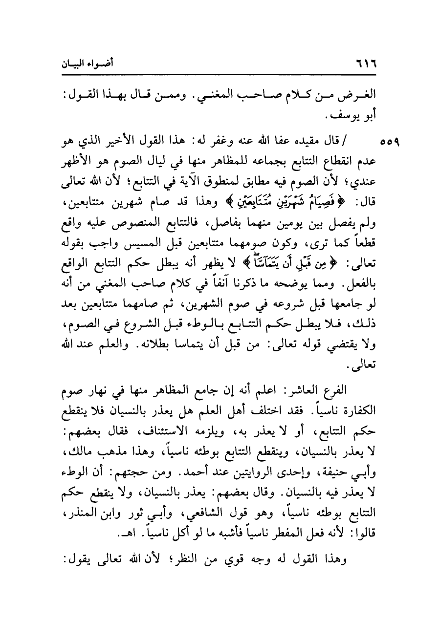 الفرع العاشر: أعلم أنه إن جامع المظاهر منها في نهار صوم الكفارة ناسيًا. فقد اختلف أهل العلم هل يعذر بالنسيان فلا ينقطع حكم التتابع، أو لا يعذر به، ويلزمه الاستئناف، فقال بعضهم: لا يعذر بالنسيان، وينقطع التتابع بوطئه ناسيًا، وهذا مذهب مالك، وأبي حنيفة، وإحدى الروايتين عند أحمد. ومن حجتهم: أن الوطء لا يعذر فيه بالنسيان. وقال بعضهم: يعذر بالنسيان، ولا ينقطع حكم التتابع بوطئه ناسيًا، وهو قول الشافعي، وأبي ثور وابن المنذر، قالوا: لأنه فعل المفطر ناسيًا فأشبه ما لو أكل ناسيًا. اهـ.