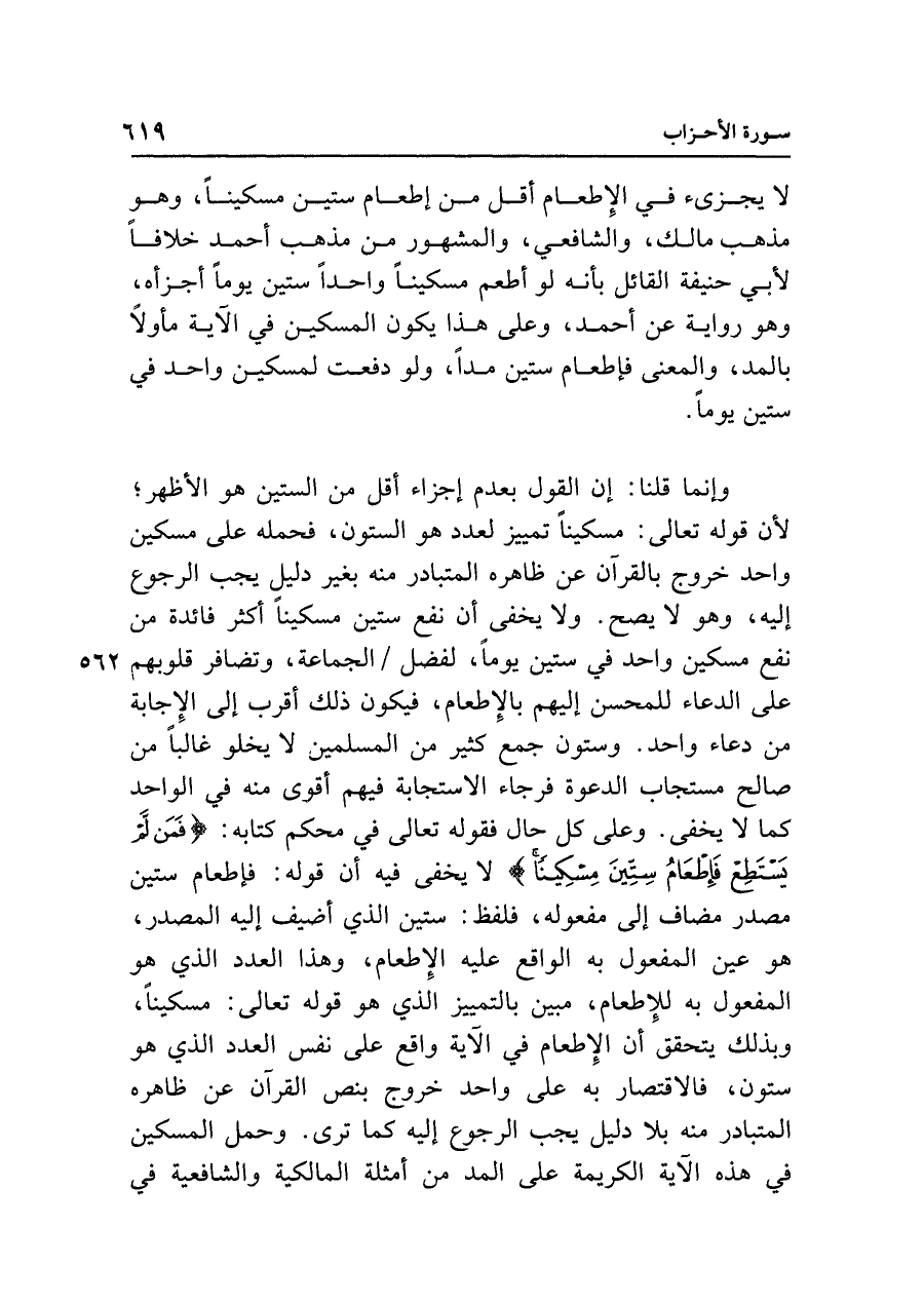 وإنما قلنا: إن القول بعدم إجزاء أقل من الستين هو الأظهر؛ لأن قوله تعالى: مسكينًا تمييز لعدد هو الستون، فحمله على مسكين واحد خروج بالقرآن عن ظاهره المتبادر منه بغير دليل يجب الرجوع إليه، وهو لا يصح. ولا يخفى أن نفع ستين مسكينًا أكثر فائدة من نفع مسكين واحد في ستين يومًا، لفضل الجماعة، وتضافر قلوبهم على الدعاء للمحسن إليهم بالإِطعام، فيكون ذلك أقرب إلى الإِجابة من دعاء واحد. وستون جمع كثير من المسلمين لا يخلو غالبًا من صالح مستجاب الدعوة فرجاء الاستجابة فيهم أقوى منه في الواحد كما لا يخفى. وعلى كل حال فقوله تعالى في محكم كتابه: {فَمَنْ لَمْ يَسْتَطِعْ فَإِطْعَامُ سِتِّينَ مِسْكِينًا} لا يخفى فيه أن قوله: فإطعام ستين مصدر مضاف إلى مفعوله، فلفظ: ستين الذي أضيف إليه المصدر، هو عين المفعول به الواقع عليه الإِطعام، وهذا العدد الذي هو المفعول به للإِطعام، مبين بالتمييز الذي هو قوله تعالى: مسكينًا، وبذلك يتحقق أن الإِطعام في الآية واقع على نفس العدد الذي هو ستون، فالاقتصار به على واحد خروج بنص القرآن عن ظاهره المتبادر منه بلا دليل يجب الرجوع إليه كما ترى. وحمل المسكين في هذه الآية الكريمة على المد من أمثلة المالكية والشافعية في