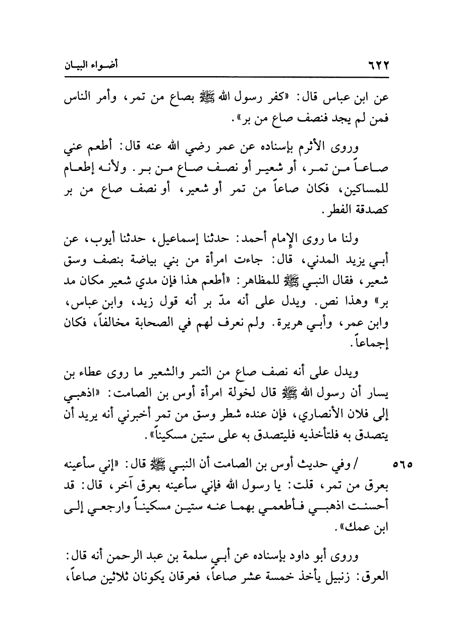 ولنا ما روى الإِمام أحمد: حدثنا إسماعيل، حدثنا أيوب، عن أبي يزيد المدني، قال. جاءت امرأة من بني بياضة بنصف وسق شعير، فقال النبي - صلى الله عليه وسلم - للمظاهر: "أطعم هذا فإن مدي شعير مكان مد بر" وهذا نص. ويدل على أنه مدّ بر أنه قول زيد، وابن عباس، وابن عمر، وأبي هريرة. ولم نعرف لهم في الصحابة مخالفًا، فكان إجماعًا.
