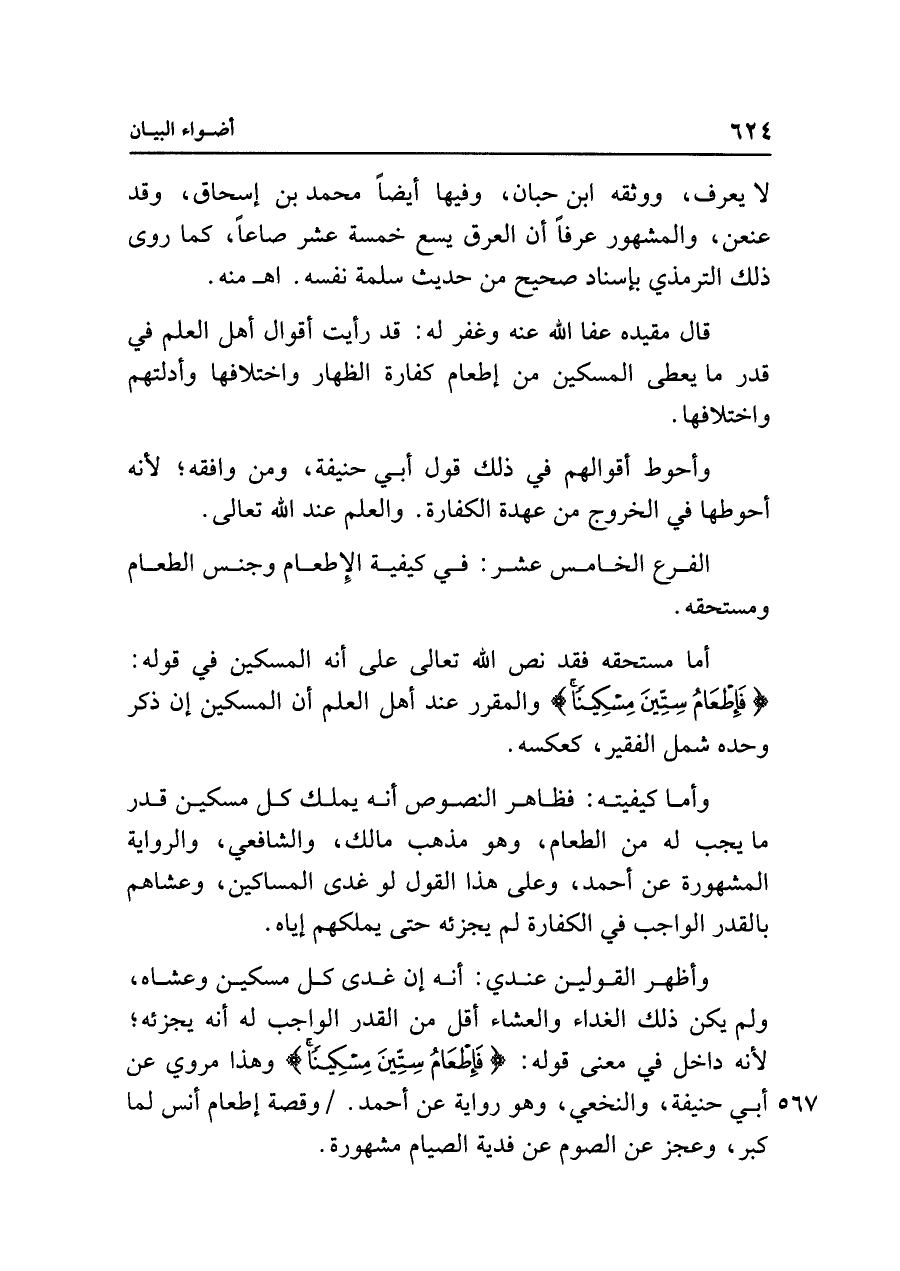 قال مقيده عفا الله عنه وغفر له: قد رأيت أقوال أهل العلم في قدر ما يعطى المسكين من إطعام كفارة الظهار واختلافها وأدلتهم واختلافها.