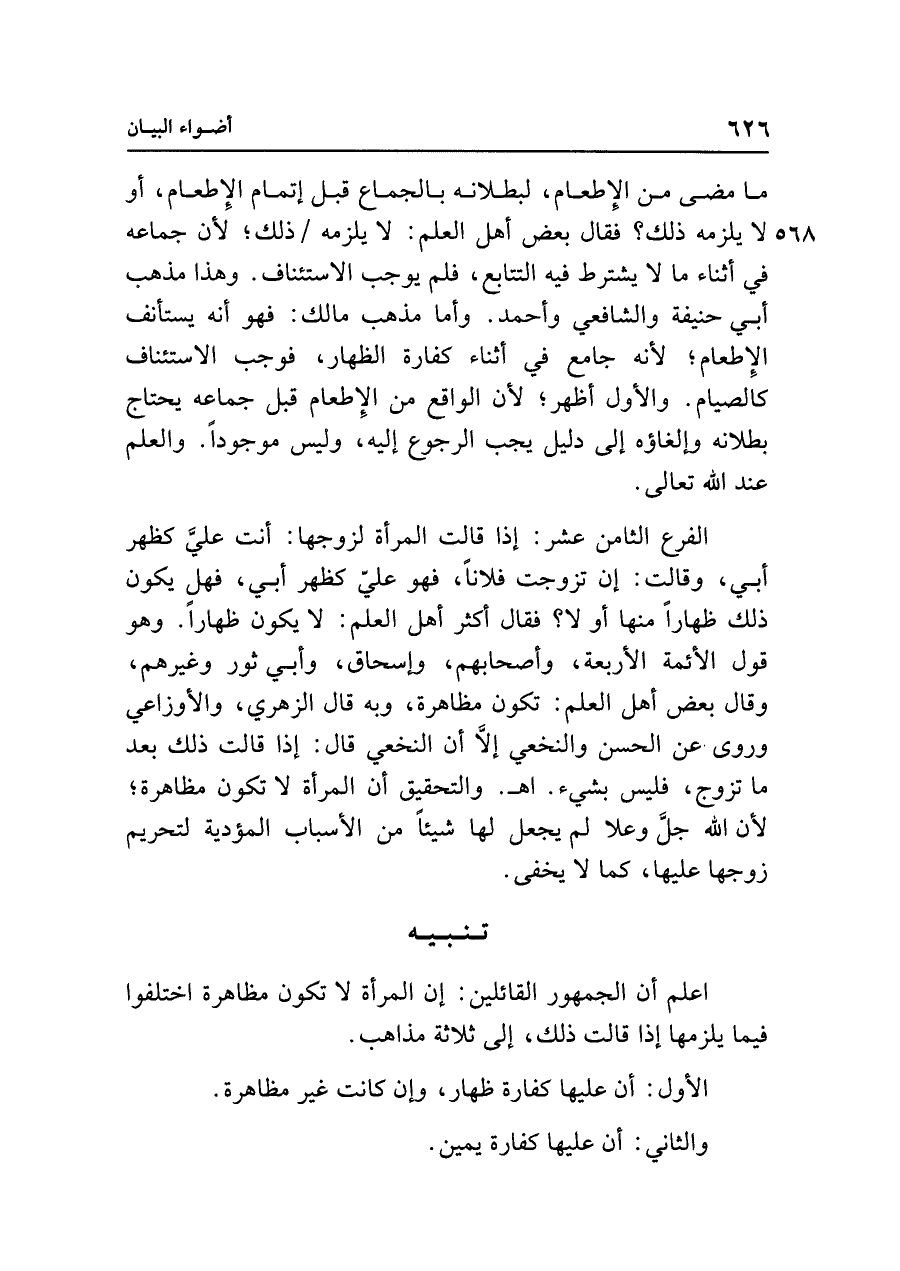 ما مضى من الإِطعام، لبطلانه بالجماع قبل إتمام الإِطعام، أو لا يلزمه ذلك؟ فقال بعض أهل العلم: لا يلزمه ذلك، لأن جماعه في أثناء ما لا يشترط فيه التتابع، فلم يوجب الاستئناف. وهذا مذهب أبي حنيفة والشافعي وأحمد. وأما مذهب مالك: فهو أنه يستأنف الإِطعام؛ لأنه جامع في أثناء كفارة الظهار، فوجب الاستئناف كالصيام. والأول أظهر، لأن الواقع من الإِطعام قبل جماعه يحتاج بطلانه وإلغاؤه إلى دليل يجب الرجوع إليه، وليس موجودًا. والعلم عند الله تعالى.
