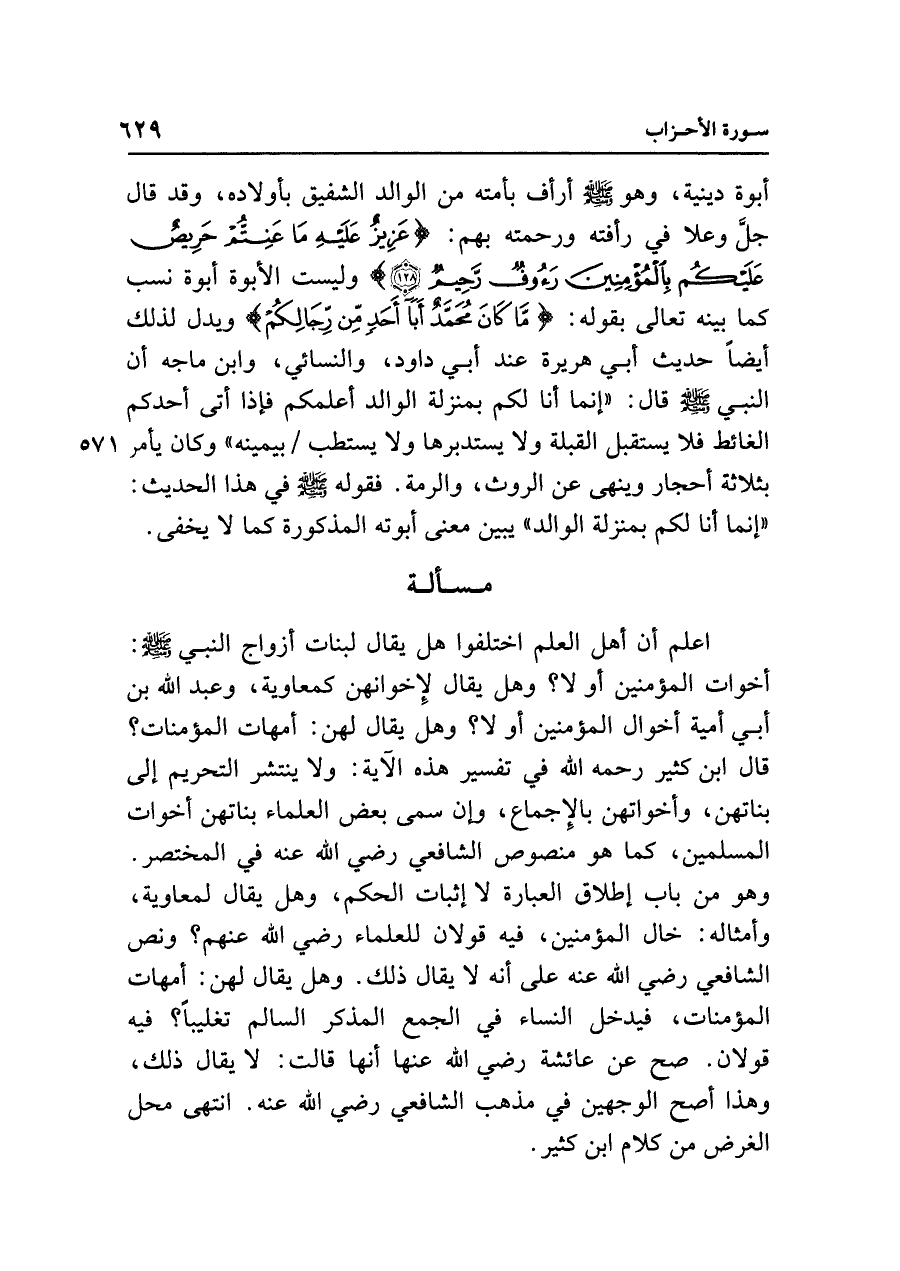 أبوة دينية، وهو - صلى الله عليه وسلم - أرأف بأمته من الوالد الشفيق بأولاده، وقد قال جلَّ وعلا في رأفته ورحمته بهم. {عَزِيزٌ عَلَيْهِ مَاعَنِتُّمْ حَرِيصٌ عَلَيْكُمْ بِالْمُؤْمِنِينَ رَءُوفٌ رَحِيمٌ (١٢٨)} وليست الأبوة أبوة نسب كما بينه تعالى بقوله: {مَا كَانَ مُحَمَّدٌ أَبَا أَحَدٍ مِنْ رِجَالِكُمْ} ويدل لذلك أيضًا حديث أبي هريرة عند أبي داود، والنسائي، وابن ماجة أن النبي - صلى الله عليه وسلم - قال: "إنما أنا لكم بمنزلة الوالد أعلمكم فإذا أتى أحدكم الغائط فلا يستقبل القبلة ولا يستدبرها ولا يستطب بيمينه" وكان يأمر بثلاثة أحجار وينهى عن الروث، والرمة. فقوله - صلى الله عليه وسلم - في هذا الحديث: "إنما أنا لكم بمنزلة الوالد" يبين معنى أبوته المذكورة كما لا يخفى.