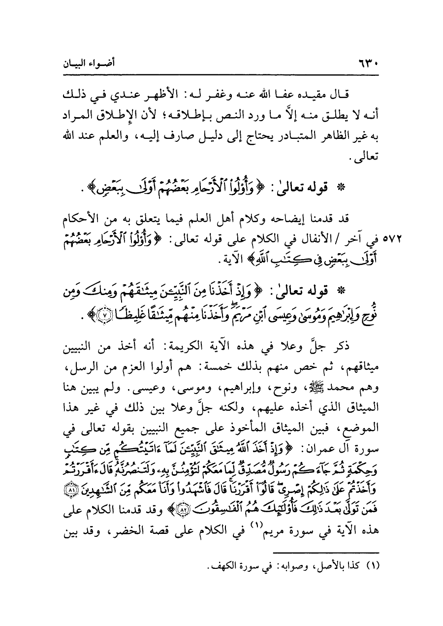 قد قدمنا إيضاحه وكلام أهل العلم فيما يتعلق به من الأحكام في آخر الأنفال في الكلام على قوله تعالى: {وَأُولُو الْأَرْحَامِ بَعْضُهُمْ أَوْلَى بِبَعْضٍ فِي كِتَابِ اللَّهِ} الآية.