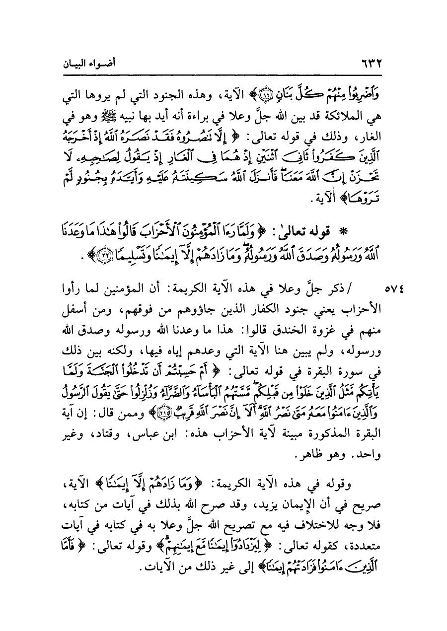 وقوله في هذه الآية الكريمة: {وَمَا زَادَهُمْ إِلَّا إِيمَانًا} الآية، صريح في أن الإِيمان يزيد، وقد صرح الله بذلك في آيات من كتابه، فلا وجه للاختلاف فيه مع تصريح الله جل وعلا به في كتابه في آيات متعددة، كقوله تعالى: {لِيَزْدَادُوا إِيمَانًا مَعَ إِيمَانِهِمْ} وقوله تعالى: {فَأَمَّا آمَنُوا فَزَادَتْهُمْ إِيمَانًا} إلى غير ذلك من الآيات.