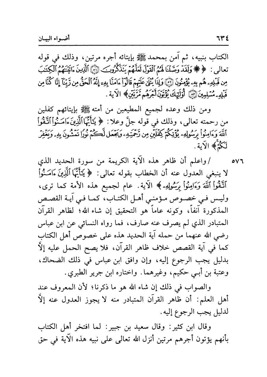 واعلم أن ظاهر هذه الآية الكريمة من سورة الحديد الذي لا ينبغي العدول عنه أن الخطاب بقوله تعالى: {يَاأَيُّهَا الَّذِينَ آمَنُوا اتَّقُوا اللَّهَ وَآمِنُوا بِرَسُولِهِ} الآية. عام لجميع هذه الأمة كما ترى، وليس في خصوص مؤمني أهل الكتاب، كما في آية القصص المذكورة آنفًا، وكونه عامًا هو التحقيق إن شاء الله؛ لظاهر القرآن المتبادر الذي لم يصرف عنه صارف، فما رواه النسائي عن ابن عباس رضي الله عنهما من حمله آية الحديد هذه على خصوص أهل الكتاب كما في آية القصص خلاف ظاهر القرآن، فلا يصح الحمل عليه إلَّا بدليل يجب الرجوع إليه، وإن وافق ابن عباس في ذلك الضحاك، وعتبة بن أبي حكيم، وغيرهما. واختاره ابن جرير الطبري.