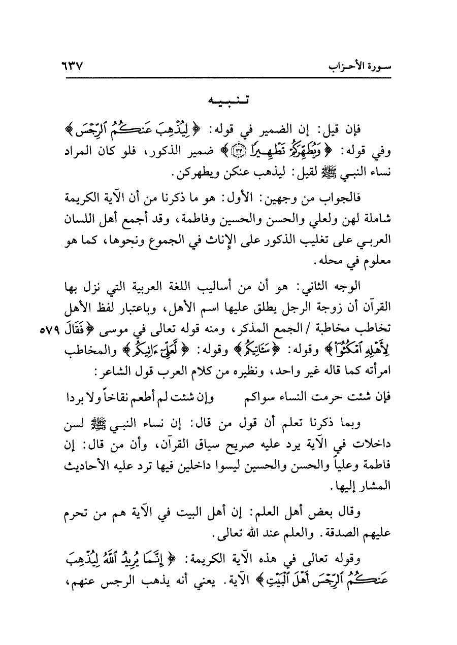 فالجواب من وجهين: الأول: هو ما ذكرنا من أن الآية الكريمة شاملة لهن ولعلي والحسن والحسين وفاطمة، وقد أجمع أهل اللسان العربي على تغليب الذكور على الإِناث في الجموع ونحوها، كما هو معلوم في محله.
