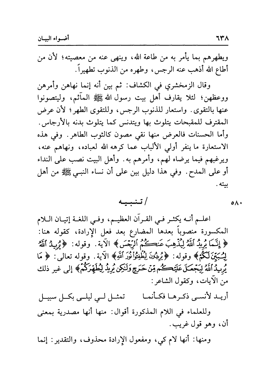 اعلم أنه يكثر في القرآن العظيم، وفي اللغة إتيان اللام المكسورة منصوبًا بعدها المضارع بعد فعل الإِرادة، كقوله هنا: {إِنَّمَا يُرِيدُ اللَّهُ لِيُذْهِبَ عَنْكُمُ الرِّجْسَ} الآية. وقوله: {يُرِيدُ اللَّهُ لِيُبَيِّنَ لَكُمْ} وقوله: {يُرِيدُونَ لِيُطْفِئُوا نُورَ اللَّهِ} الآية. وقوله تعالى: {مَا يُرِيدُ اللَّهُ لِيَجْعَلَ عَلَيْكُمْ مِنْ حَرَجٍ وَلَكِنْ يُرِيدُ لِيُطَهِّرَكُمْ} إلى غير ذلك من الآيات، وكقول الشاعر: